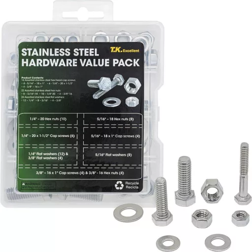 Setul de șuruburi din oțel inoxidabil T.K.Excellent este un set versatil de 60 de piese, perfect pentru diverse lucrări de asamblare și reparații. Acest set practic include cele mai frecvent utilizate dimensiuni de șuruburi, piulițe și șaibe, astfel încât veți avea întotdeauna la îndemână componenta potrivită.