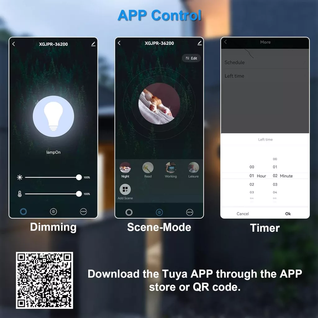 - Control prin aplicație WiFi: Control complet asupra luminozității (1%-100%) și temperaturii de culoare (3000K-6000K) prin intermediul aplicației Tuya