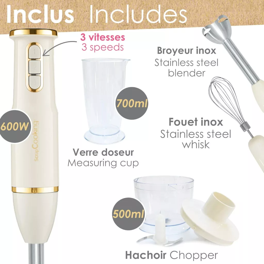 Összegzés: A ScrapCooking 3 az 1-ben kézi mixer kiváló választás azok számára, akik egy megbízható, sokoldalú és stílusos konyhai eszközt keresnek. A 600 watt-os teljesítmény, a 3 sebességfokozat és a teljes kiegészítő csomag biztosítja, hogy minden konyhai feladat könnyedén elvégezhető. Az elegáns retro design és a francia minőség garantálása ezt a mixert nemcsak funkcionális, hanem egy igazi konyhai ékszerzemmé teszi.