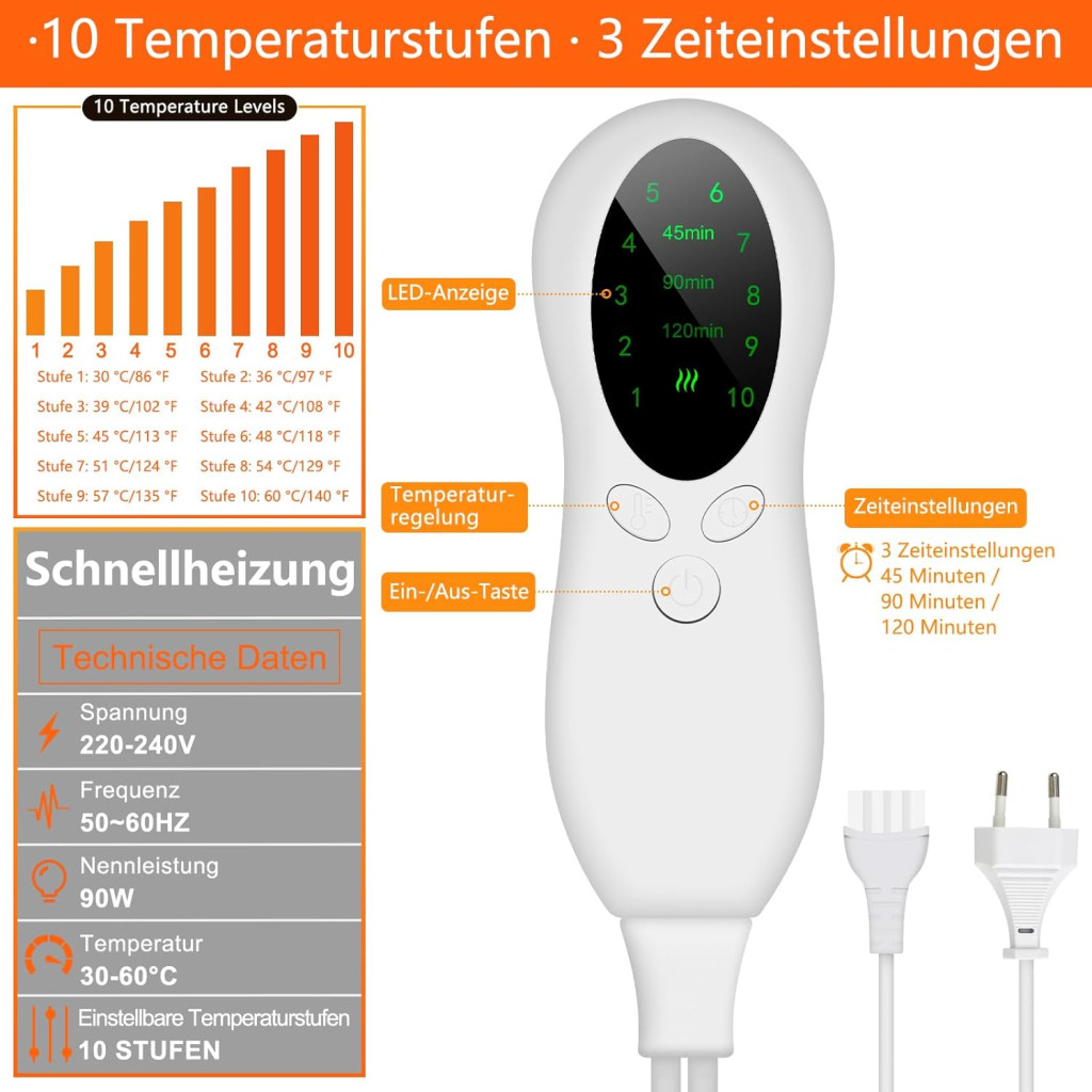 Pentru cele mai bune rezultate, vă recomandăm să setați nivelul de temperatură între 6 și 8, ceea ce asigură o temperatură de 45-50°C. Acesta este echilibrul ideal între o căldură confortabilă și eficiența energetică. Nu utilizați cel mai înalt nivel pentru perioade lungi de timp și fiți mereu atenți la setarea temporizatorului pentru a evita supraîncălzirea.
