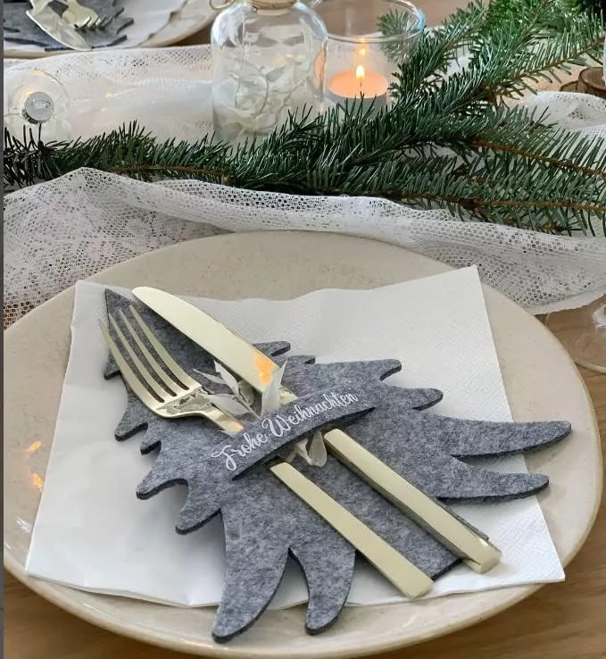 Husa MKISHINE pentru tacâmuri de Crăciun este un adevărat deliciu festiv, care va deveni punctul culminant al oricărei mese de Crăciun. Această husă din fetru realizată manual este decorată cu o inscripție elegantă "Frohe Weihnachten", care reflectă stilul rural german. Puteți plasa cu ușurință tacâmurile, șervețelele sau meniurile în ea, garantând că veți impresiona oaspeții în timpul cinei de Advent și în seara de Crăciun.