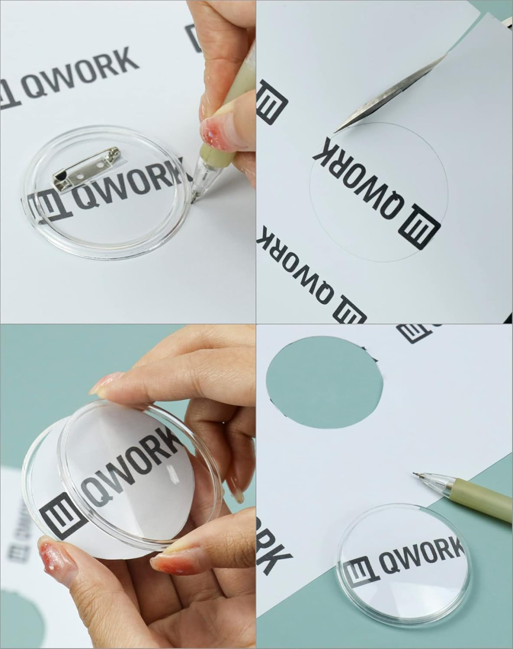 Setul de insigne QWORK este extrem de ușor de utilizat. Procesul de aplicare constă în doar trei pași: mai întâi scoateți capacul, apoi introduceți hârtia sau imaginea și, în final, puneți capacul la loc. Închiderea strânsă asigură faptul că hârtia rămâne în siguranță în interiorul insignei și nu se deteriorează în timpul utilizării zilnice.