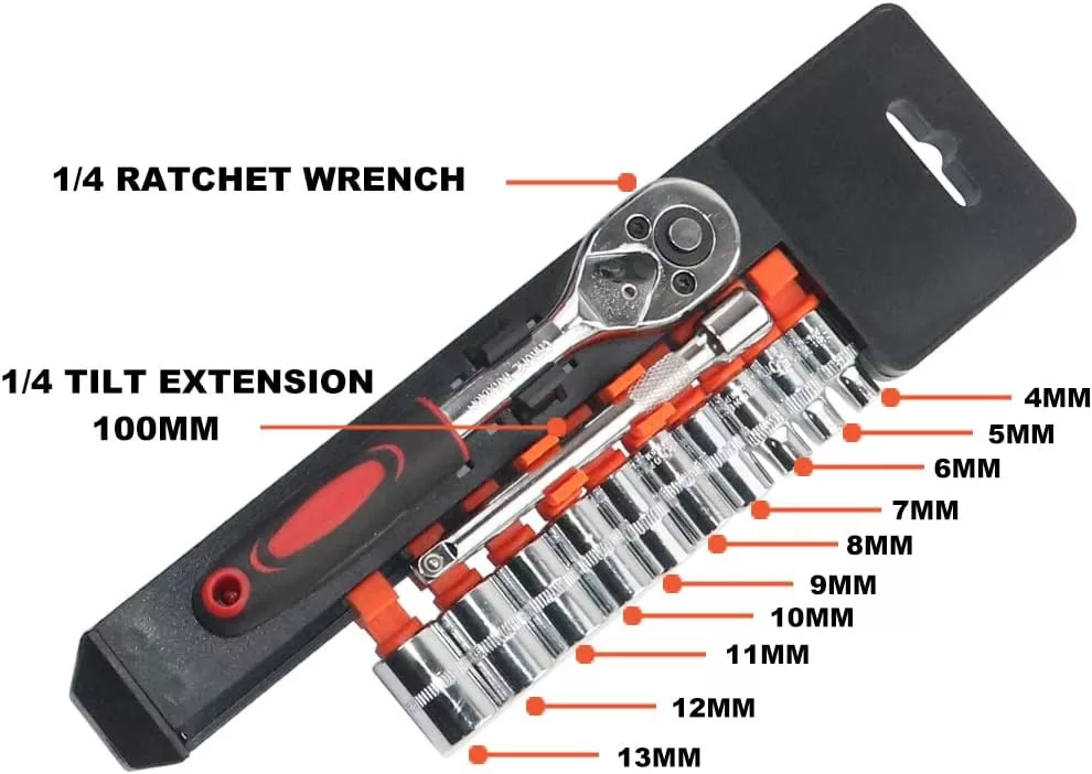- Conținutul complet al setului: 1 bucată clichet reversibil, biți hexagonali de 4-13 mm, adaptor de extensie de 100 mm