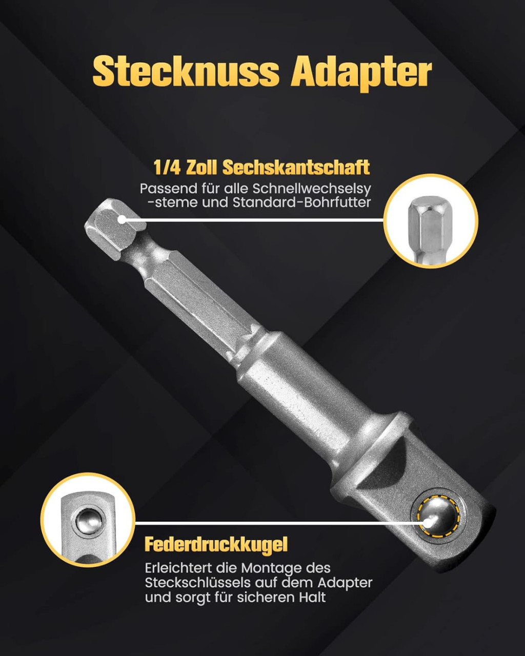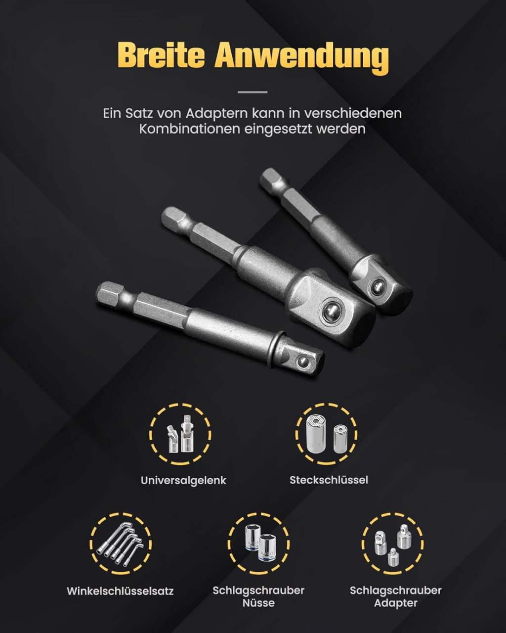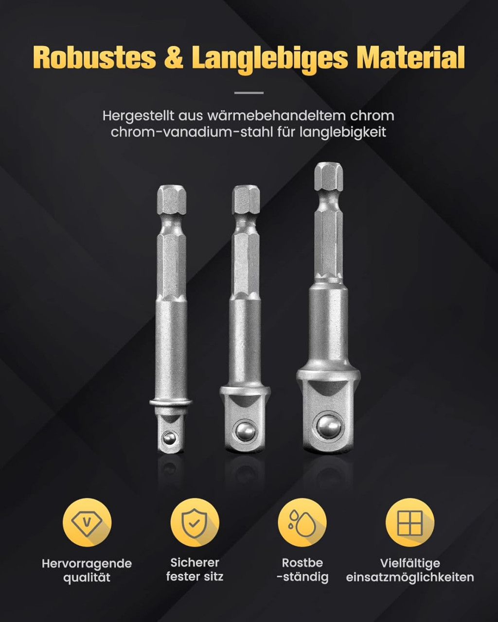 Setul de adaptoare este ideal pentru reparații auto, reparații casnice, proiecte de tip DIY și aplicații industriale. Materialul din oțel Cr-V de înaltă calitate garantează o durată de viață lungă și o performanță fiabilă, chiar și în timpul utilizării intense.