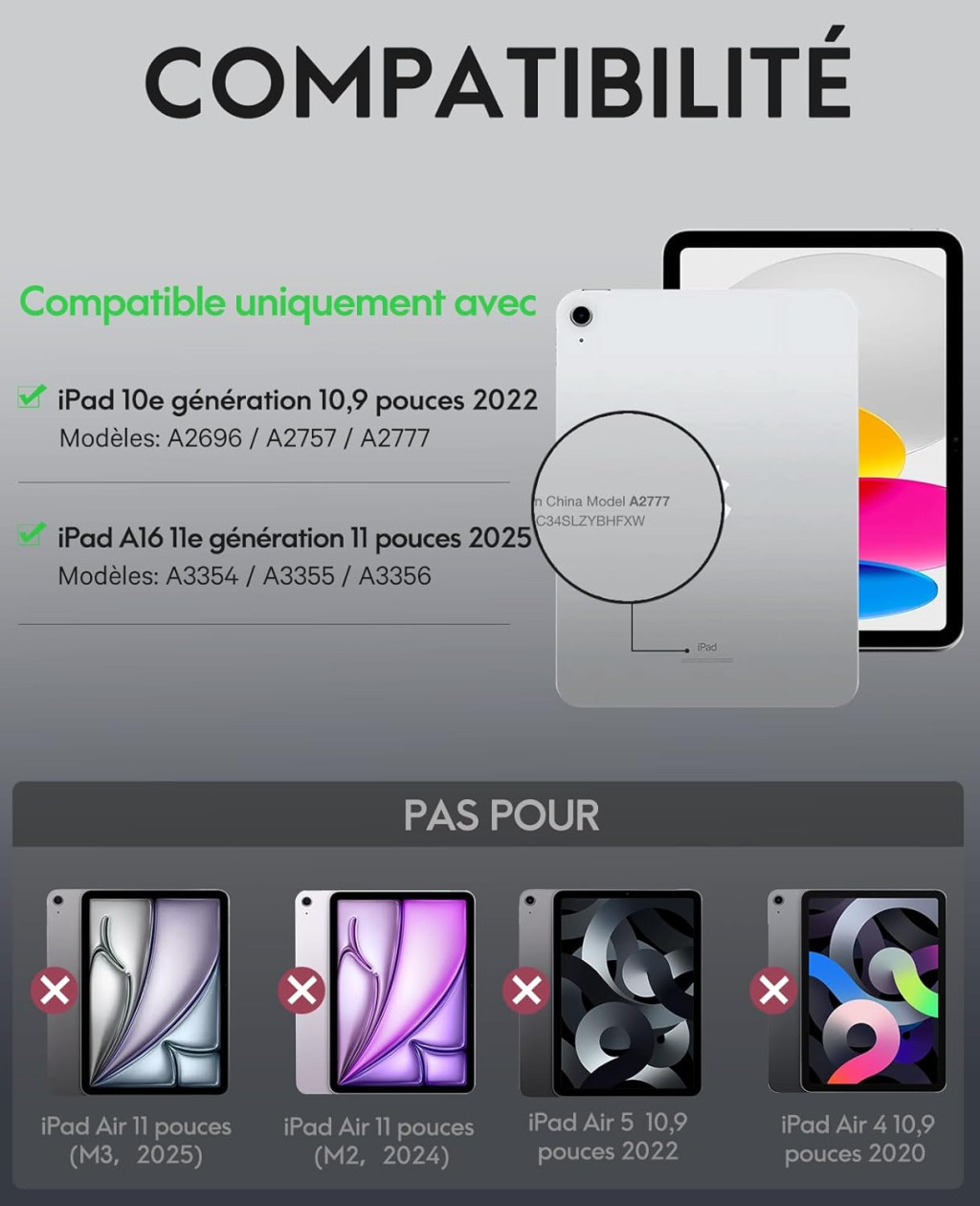 Dispozitive compatibile: Funcționează exclusiv cu iPad generația a 10-a (10,9 inch, 2022). Pentru a verifica compatibilitatea, căutați numărul modelului A2696, A2757 sau A2777 sub sigla Apple.