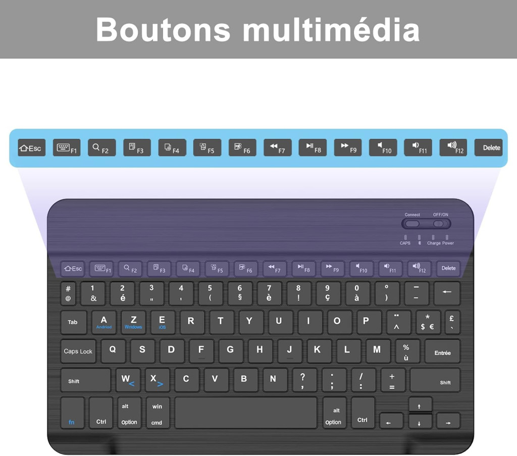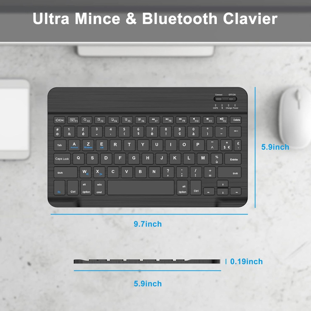 Tastatura Bluetooth JADEMALL este o soluție versatilă, ușoară și portabilă pentru cei care caută o tastatură ergonomică pentru dispozitivele mobile. Cu un layout francez AZERTY, acest dispozitiv este perfect compatibil cu iPad, iPad Pro, iPad Air, tablete Samsung, Xiaomi Pad 5, Lenovo și dispozitive Mac, precum și cu dispozitive care rulează Windows. Greutatea de 240 de grame și dimensiunea compactă de 270 x 16 x 2 cm o fac ideală pentru călătorii, lucru la birou sau utilizare acasă.