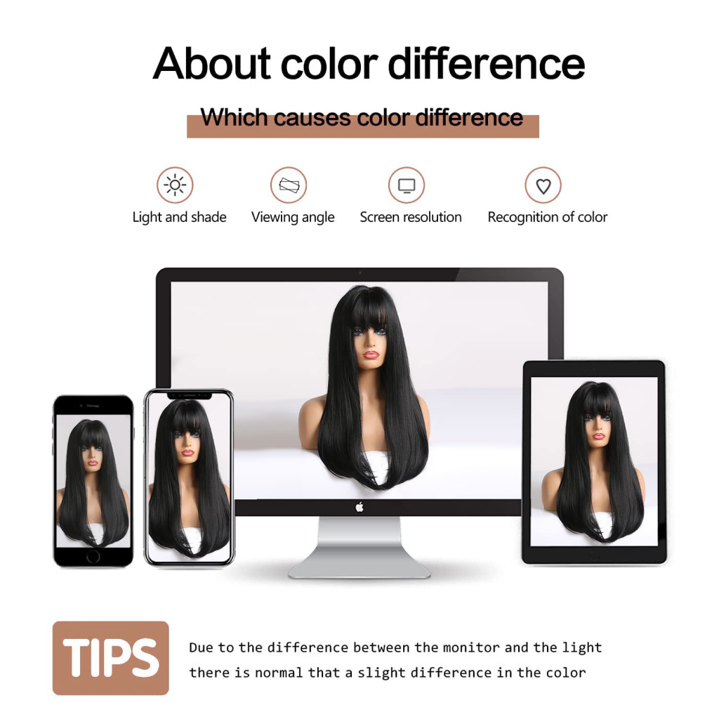 Culoarea neagră a perucăi (cod de culoare #242424) este un ton bogat și profund, care se potrivește perfect cu orice nuanță a pielii și ținută. Designul stratificat oferă o mișcare și o textură naturală, astfel încât peruca nu pare artificială sau rigidă atunci când este purtată. Bretonul încadrează perfect fața, în timp ce firele lungi și drepte oferă un aspect elegant și sofisticat.