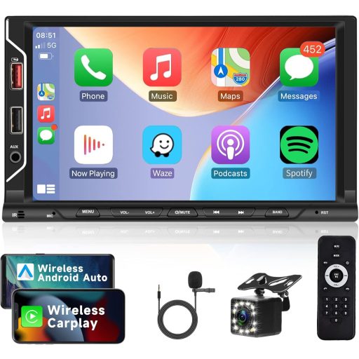 Radio auto 2 DIN cu Apple CarPlay wireless, ecran tactil de 7", mirroring Android, hands-free Bluetooth, FM, USB, cameră de marșarier