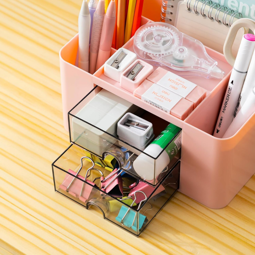 Organizator de birou Wlevzzor cu 6 compartimente și sertar, suport roz pentru articole de papetărie
