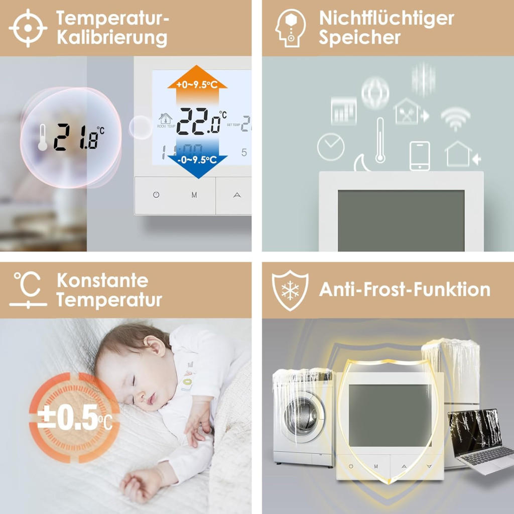 Termostatul inteligent WiFi Beok pentru încălzire prin pardoseală combină confortul și eficiența energetică ale unei case moderne, revoluționând modul în care este gestionat sistemul de încălzire. Acest dispozitiv inteligent oferă soluția perfectă atât pentru sistemele de încălzire prin pardoseală cu apă, cât și pentru controlul centralelor pe gaz. Termostatul cu design elegant, de culoare albă, nu este doar funcțional, ci și un plus estetic pentru casa ta. Cu o capacitate de comutare de 3A, dispozitivul funcționează fiabil la o tensiune de rețea de 200-240V, potrivindu-se perfect sistemelor electrice locale.