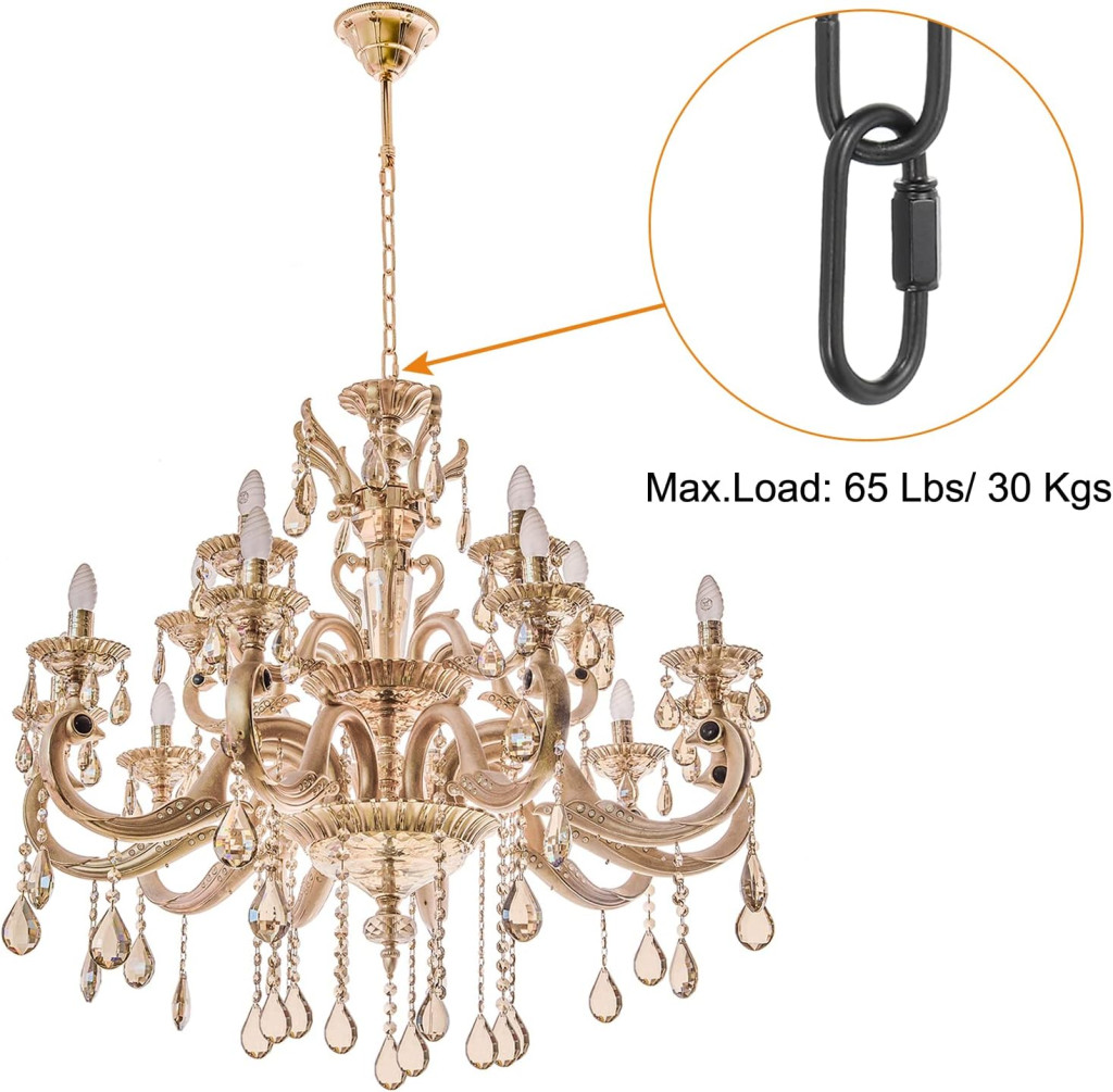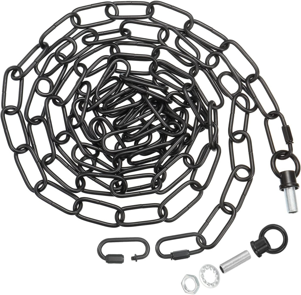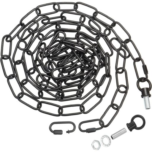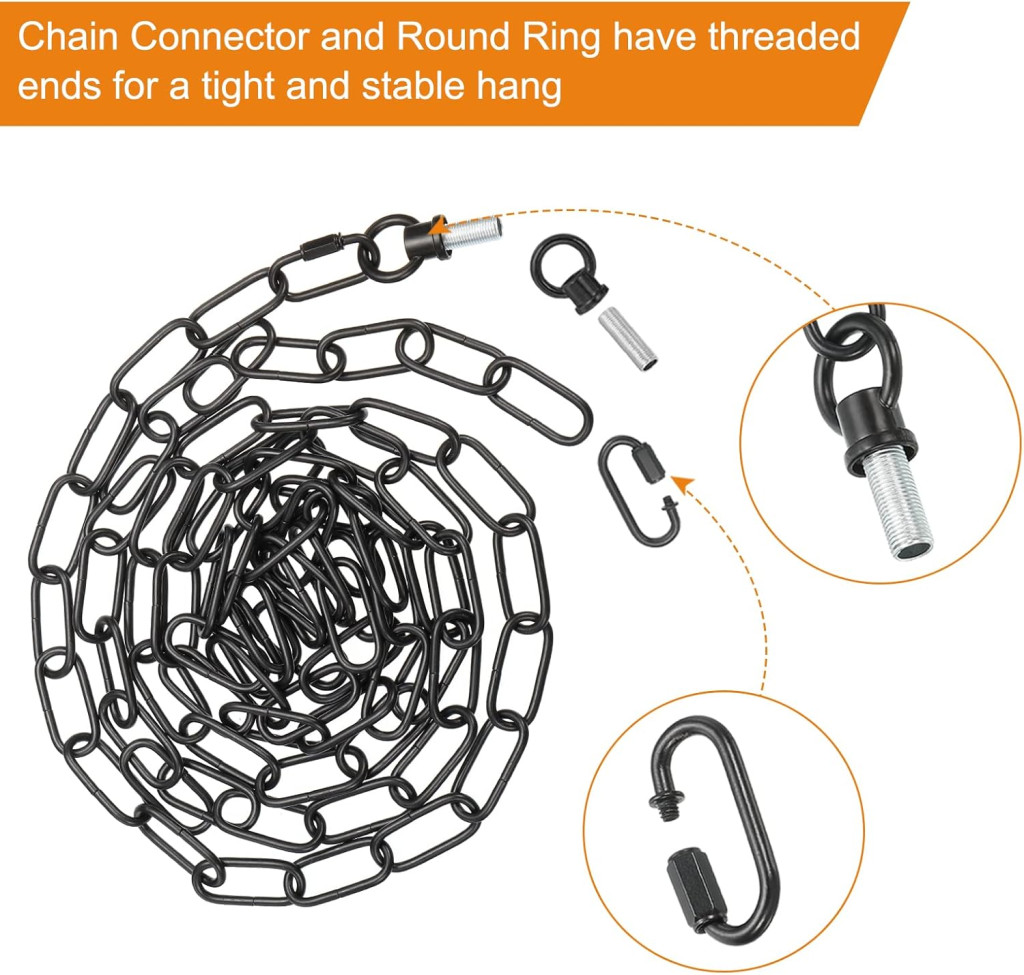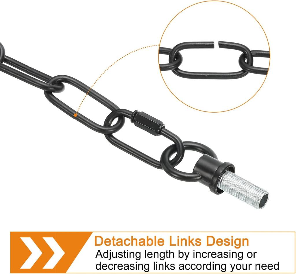 Instalarea este extrem de simplă și rapidă. Ca prim pas, fixați inelul închis cu șuruburi pe tavan sau pe o altă suprafață stabilă. Apoi, conectați lanțul și inelul la cleme și agățați obiectele dorite. Lungimea lanțului poate fi reglată cu ușurință cu ajutorul clemelor incluse. Dacă aveți nevoie de un lanț mai scurt, pur și simplu folosiți un clește pentru a îndepărta zalele lanțului. Pachetul include 2 cleme reglabile, 2 șuruburi și 2 șuruburi pentru fixarea de corp sau conectarea la bec.