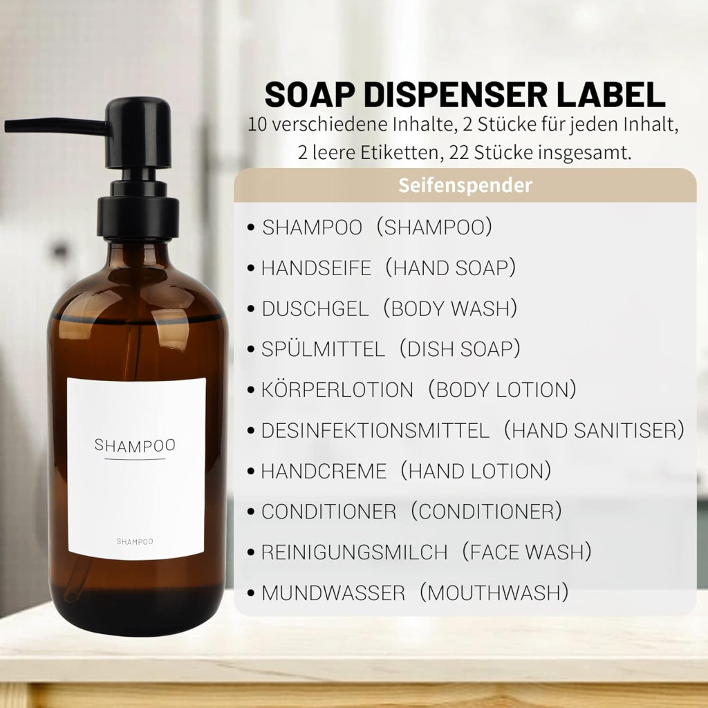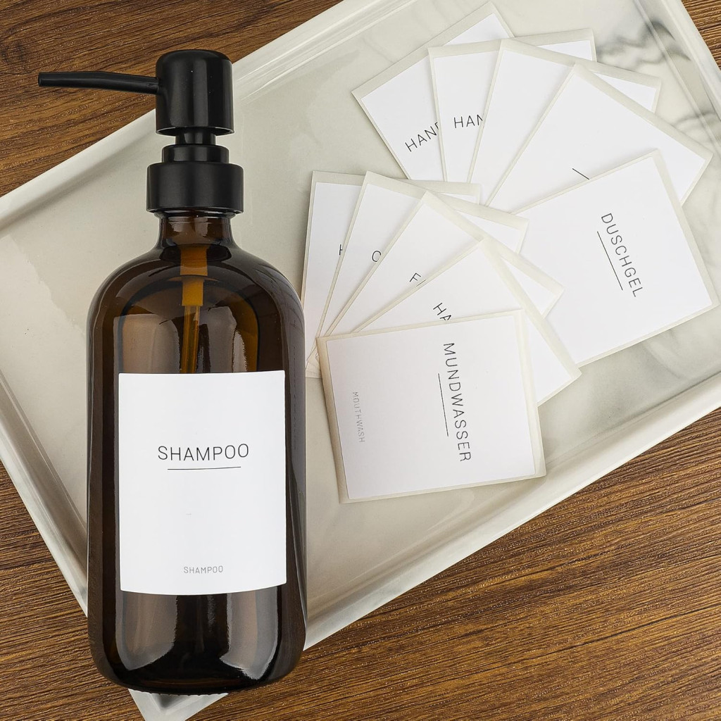 Cele 22 de etichete rezistente la apă și ulei permit identificarea ușoară a diferitelor săpunuri și lichide, iar pompele negre asigură o dozare precisă. Datorită aspectului estetic, setul funcționează și ca element decorativ pe blatul din baie sau bucătărie.