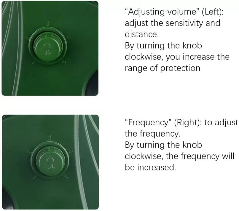 Az érzékenység gomb segítségével állítsa be a detektálási távolságot az Ön igényei szerint. A frekvencia tárcsát forgatva válassza ki a megfelelő módot az elűzni kívánt állatok típusához. Az első használat előtt töltse fel a készüléket USB-n keresztül vagy hagyja a napfényen töltődni.
