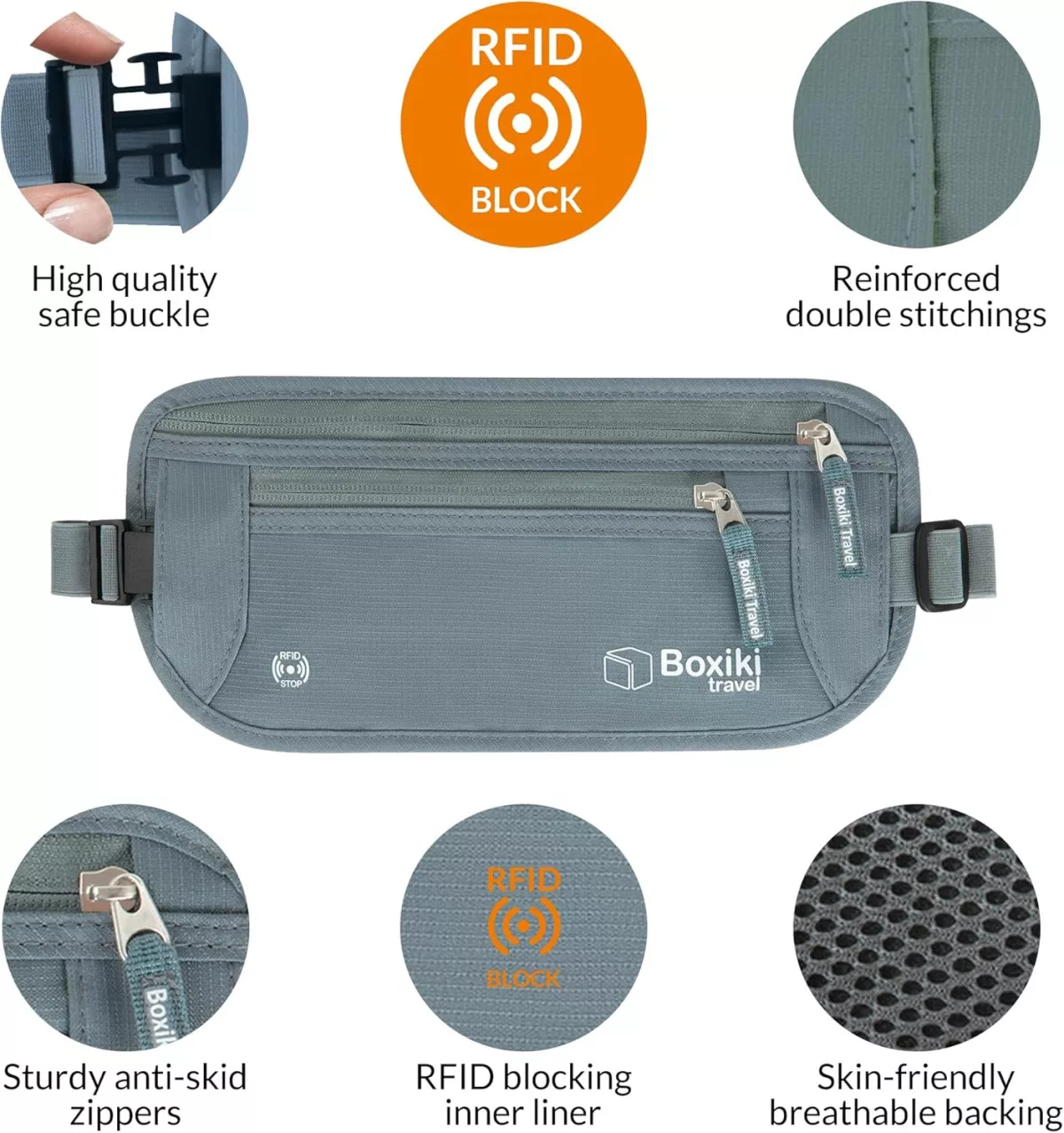 Călătoriți cu încredere, știind că valorile dvs. sunt în siguranță sub protecția setului centură de bani și suport carduri Boxiki Travel cu protecție RFID!