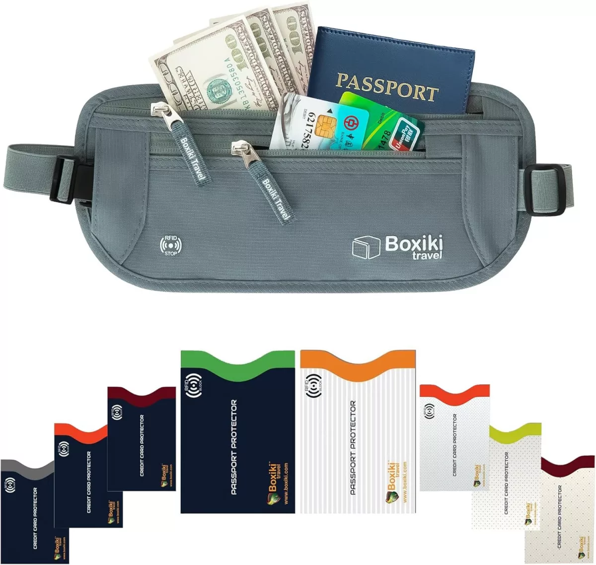 Boxiki Borsetă de călătorie antifurt cu protecție RFID - Set de 8 piese cu suporturi pentru carduri bleumarin - Portofel ascuns pentru bărbați și femei (Gri)