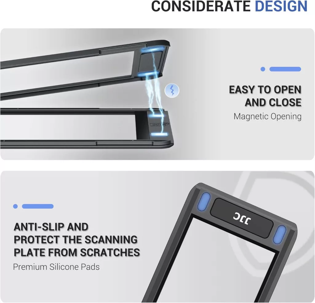 Dispozitivul este fabricat din plastic ABS ecologic, de înaltă calitate, care garantează o durată de viață lungă și performanțe fiabile. Sistemul de închidere magnetică permite deschiderea și închiderea ușoară și rapidă, în timp ce pernuțele de silicon protejează suprafața scanerului.
