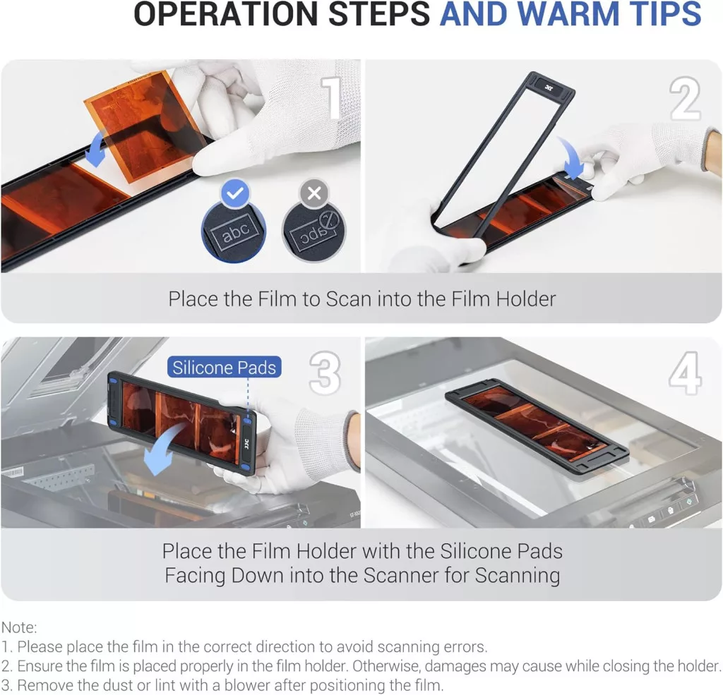 Pentru cele mai bune rezultate, asigurați-vă că plasați filmul în direcția corectă în suport. Înainte de scanare, îndepărtați praful și scamele cu un suflător. Asigurați-vă că filmul este fixat corespunzător în închiderea magnetică înainte de a închide suportul. În timpul scanării, utilizați o rezoluție înaltă (cel puțin 2400 DPI) pentru a obține cele mai bune rezultate digitale.