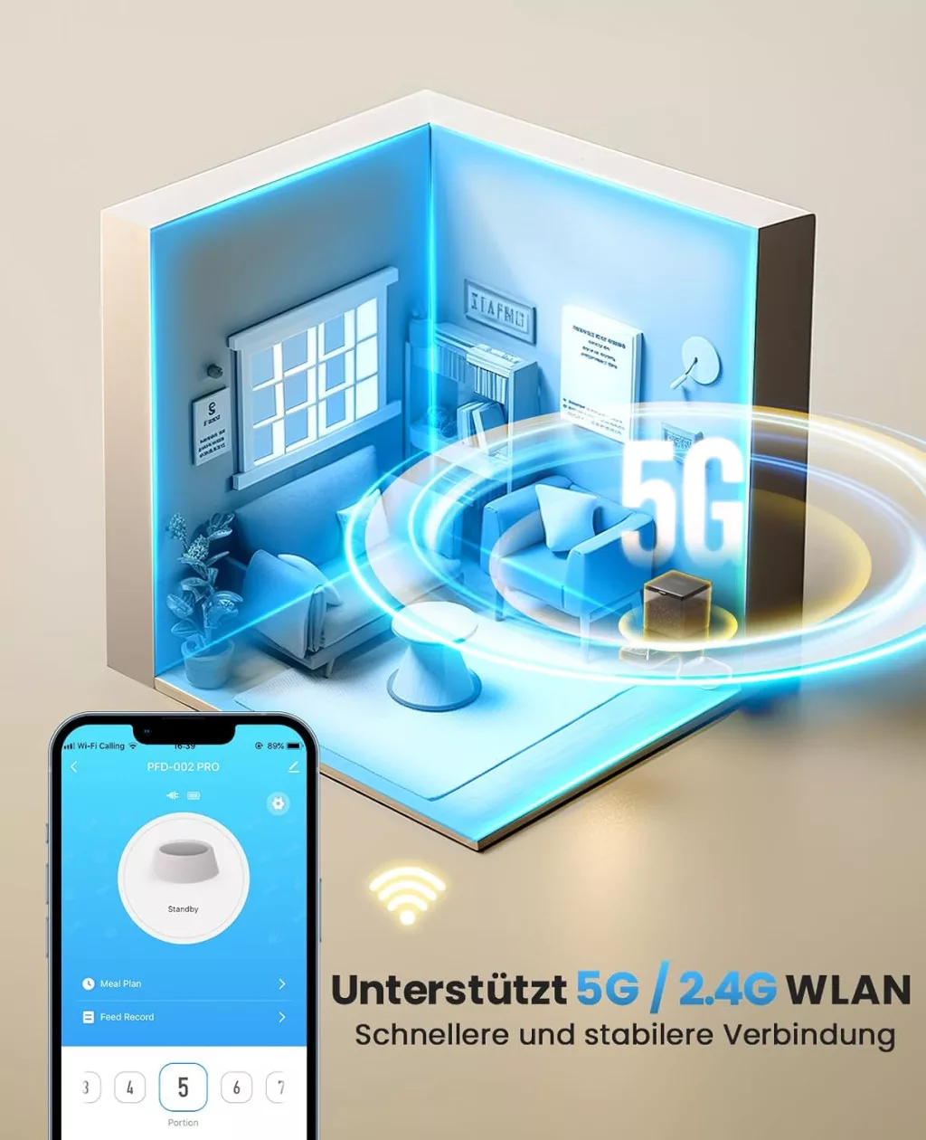 5G/2.4GHz WiFi Vezérlés: Az okostelefon alkalmazáson keresztül bárhonnan vezérelheti az etető működését, függetlenül attól, hogy otthon van-e vagy utazik.