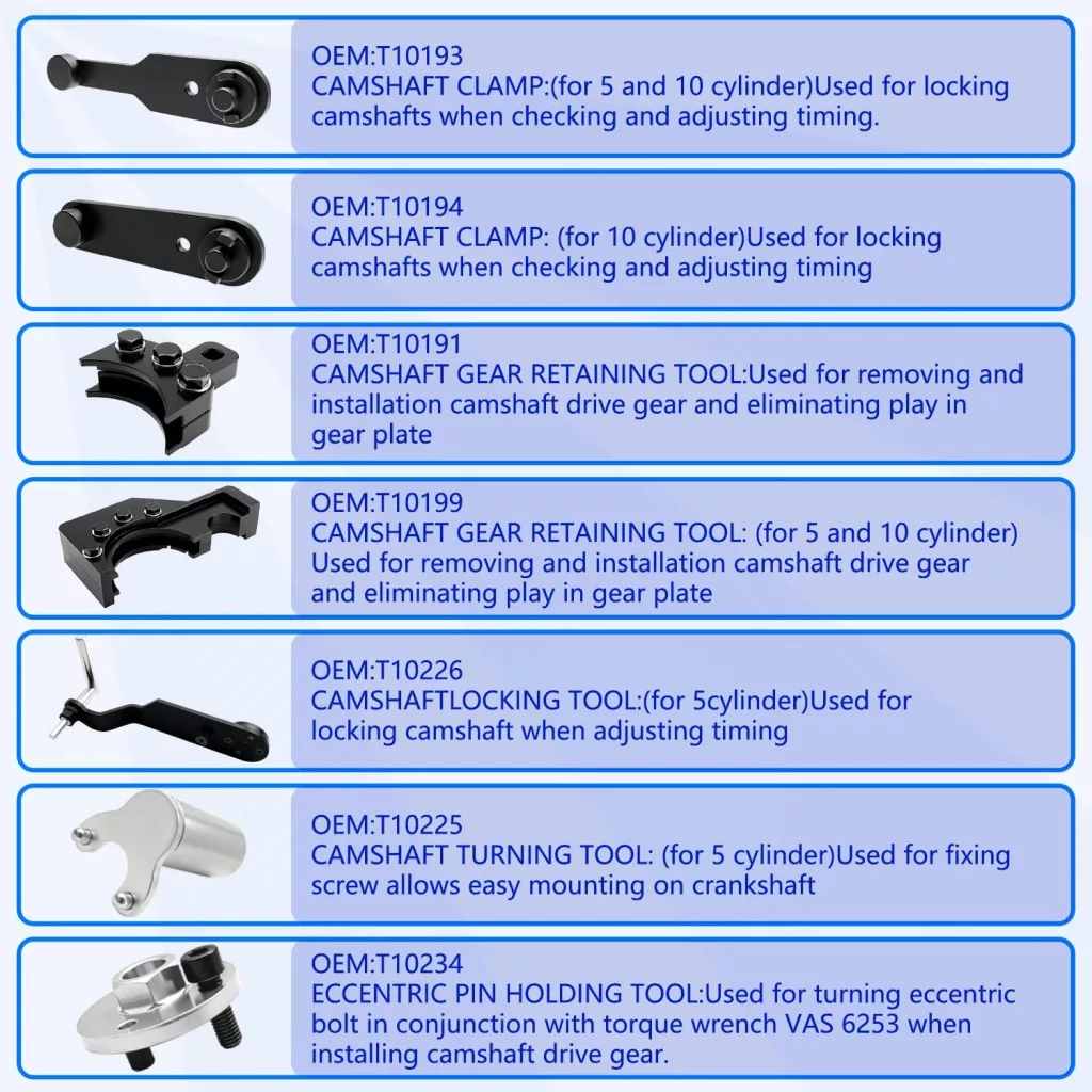 Set Complet de Scule: Scule de blocare a arborelui cu came, suport pentru roata arborelui cu came, scule de rotire a arborelui cotit, scule de aliniere a arborelui cotit și alte instrumente speciale.
