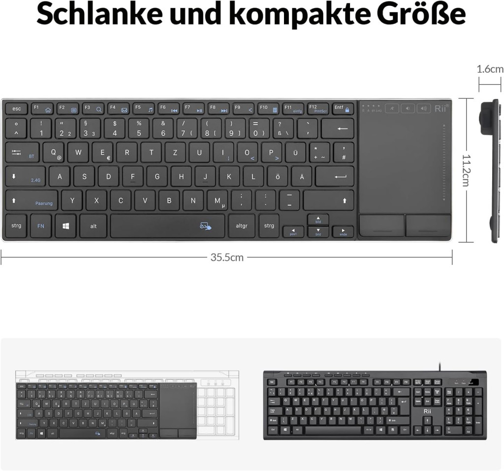 Tastatură wireless Rii cu touchpad - Conectivitate 2.4G+Bluetooth, Layout German QWERTZ, Design ultra-subțire, Compatibilă Laptop, PC