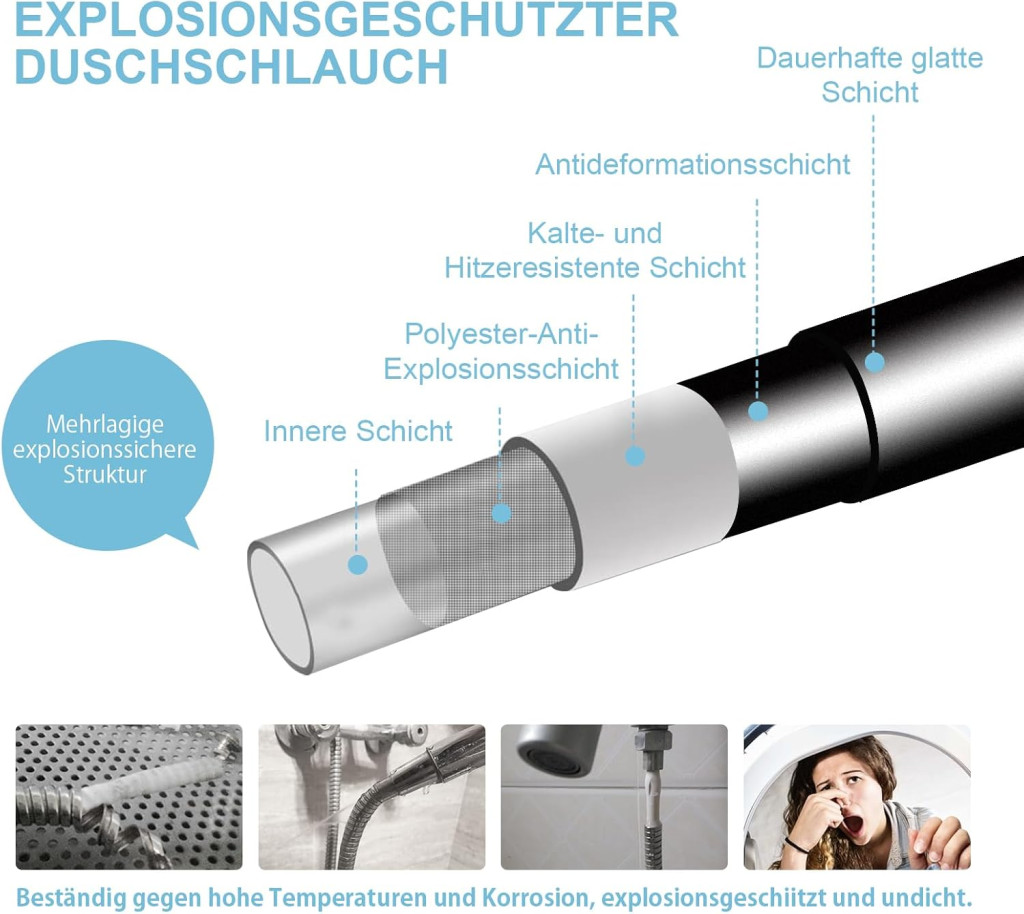 Furtunul de duș OFFO se remarcă față de produsele similare de pe piață. În timp ce majoritatea produselor concurente folosesc racorduri simple din plastic, acest furtun are racorduri premium din alamă. Structura multistrat oferă o rezistență mai bună la căldură și frig decât furtunurile tradiționale cu un singur strat. Finisajul negru mat nu numai că oferă un aspect elegant, dar ascunde și petele de apă, astfel încât arată întotdeauna curat.
