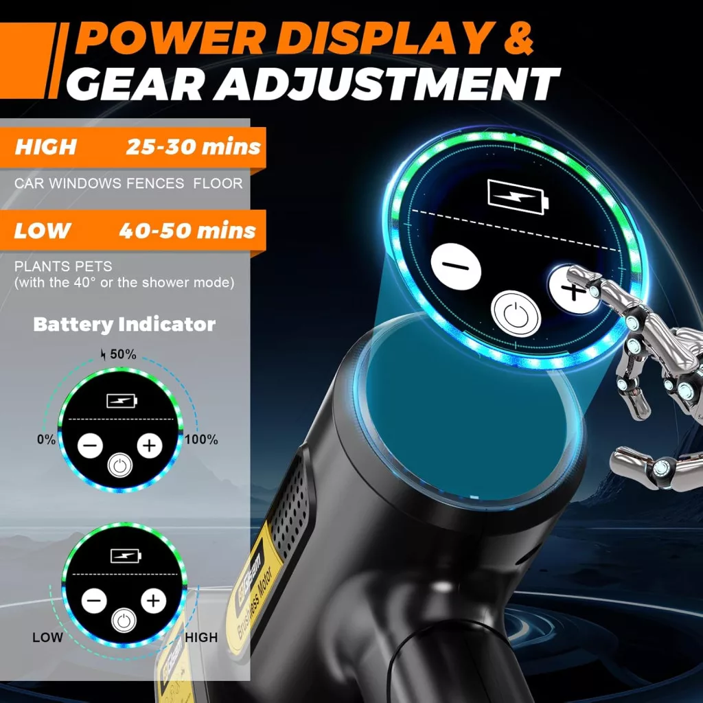 A készülék két darab nagy kapacitású 4000mA akkumulátorral érkezik, amelyek együttesen akár 90 perces folyamatos használatot tesznek lehetővé. A sokoldalúságot a 6 az 1-ben multifunkciós szórófej és a 180° fokban elforgatható fej biztosítja, amelyek segítségével minden zugot és sarkot elérhet. A habszóró tartozék pedig tökéletes az autómosáshoz vagy más felületek alapos tisztításához.