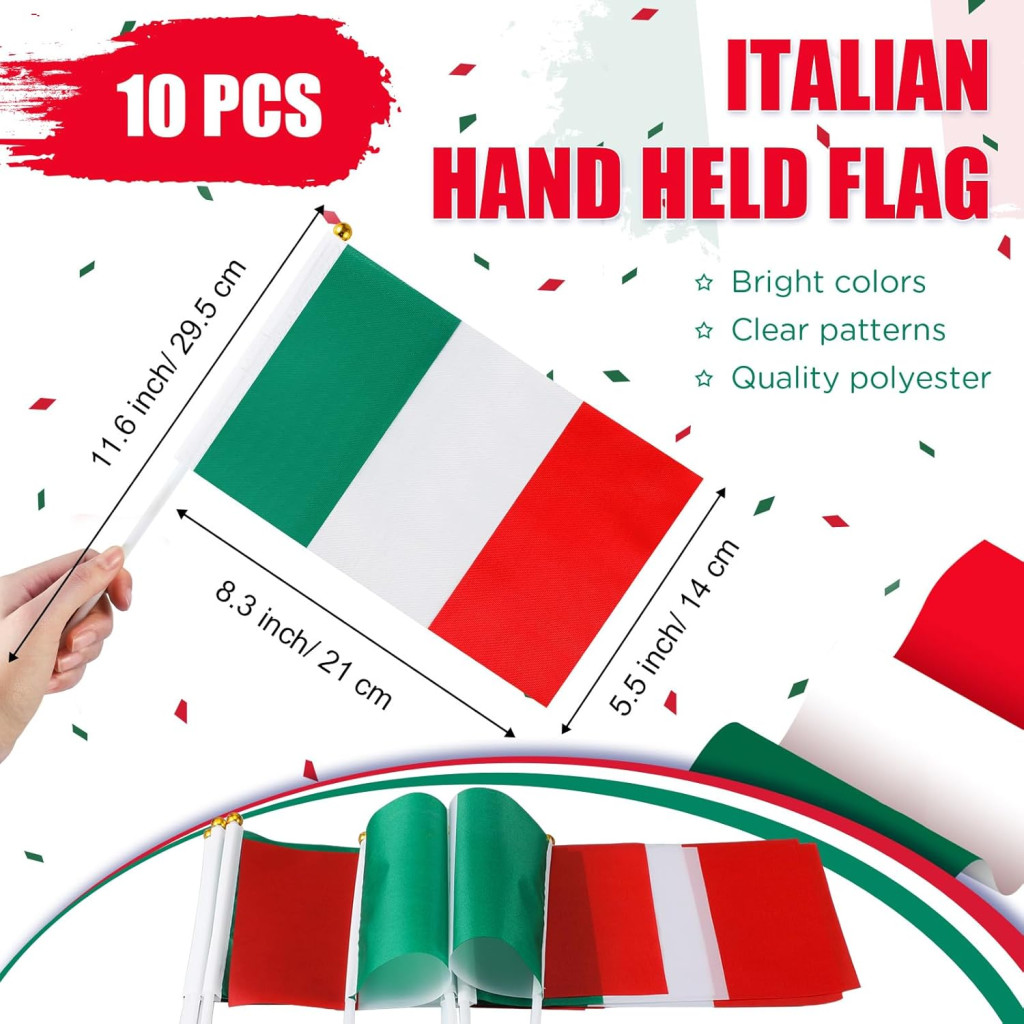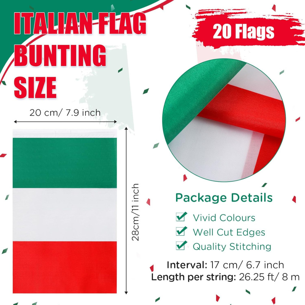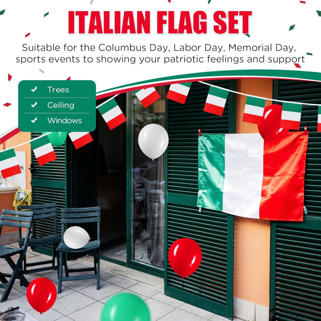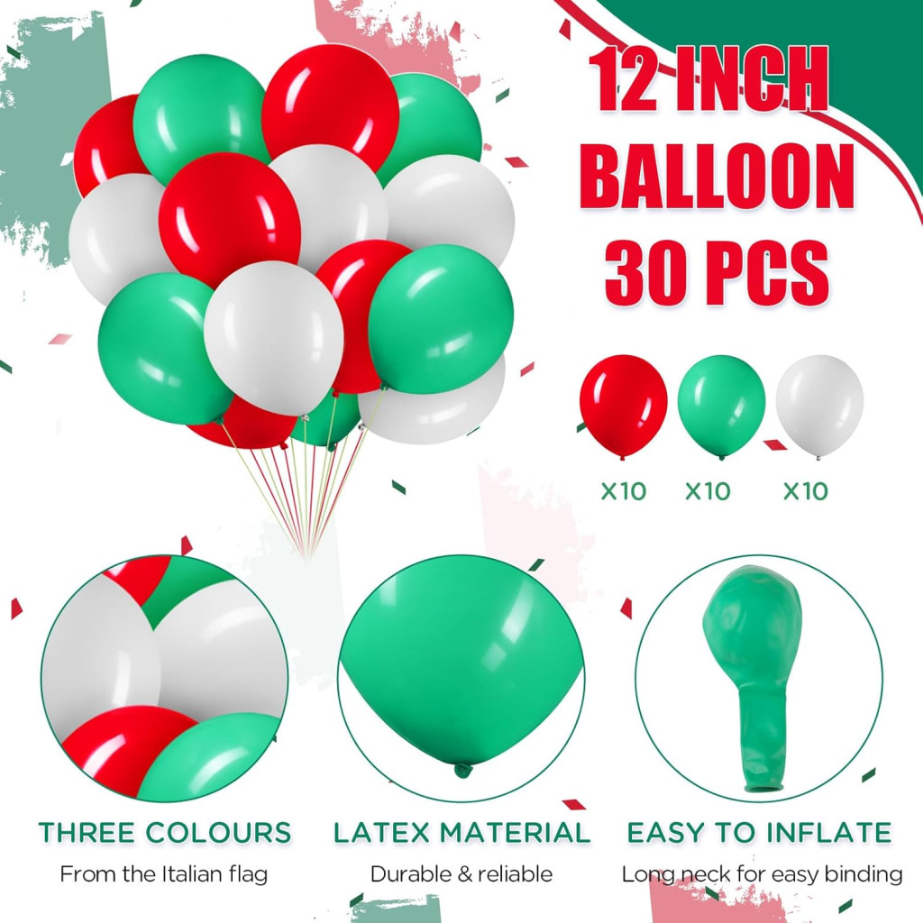 Materialele din poliester și latex garantează că decorul va rămâne frumos pentru mult timp și nu se va decolora. Culorile vii ale steagului Italiei atrag garantat atenția și creează o atmosferă patriotică.