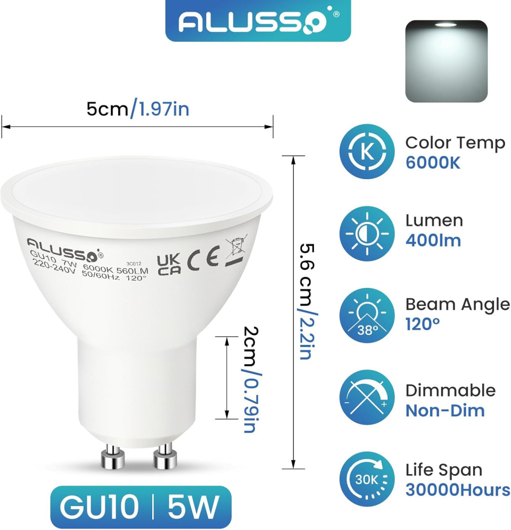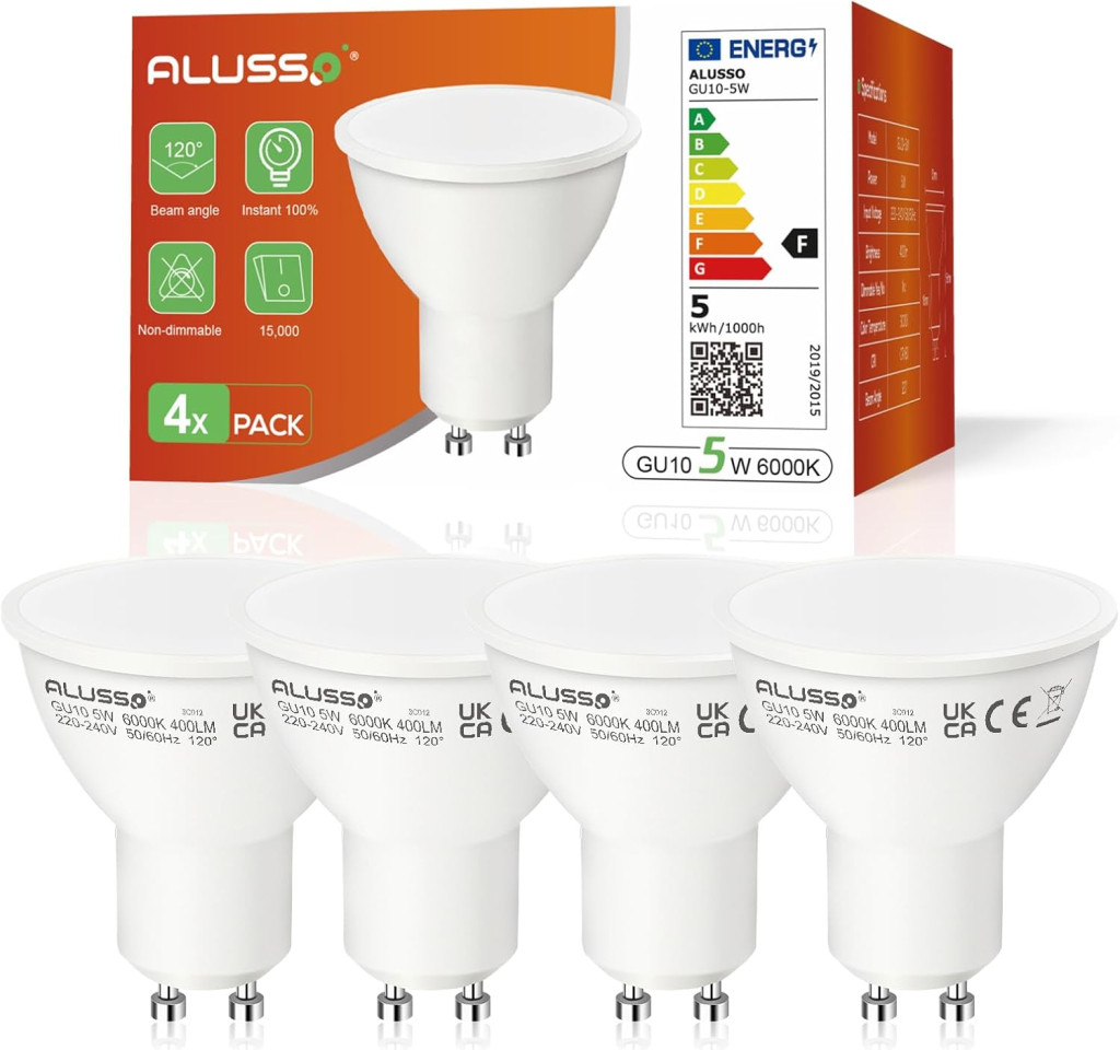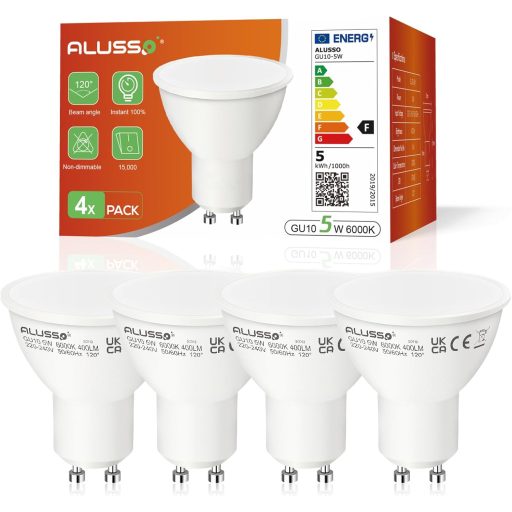 ALUSSO LIGHTING GU10 LED 5W Bec - Alb Rece 6000K - Pachet de 4 bucăți Prezentarea Produsului