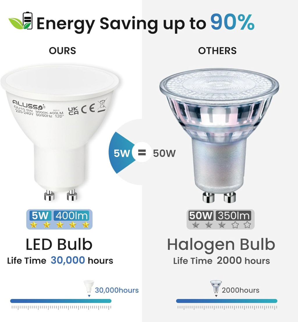 - ✅ Economii semnificative de energie: Consum de energie cu 90% mai mic comparativ cu becurile cu halogen tradiționale