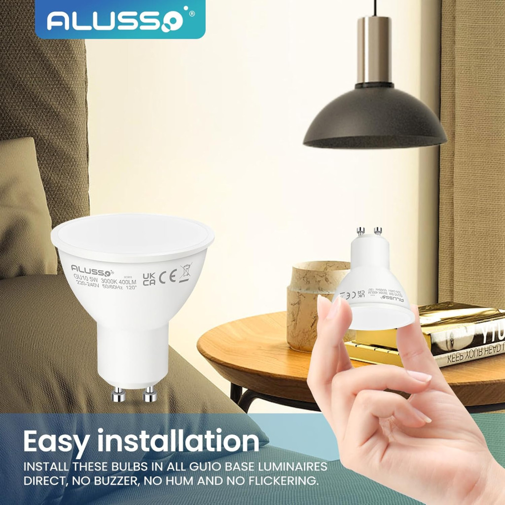 Becurile GU10 LED ALUSSO LIGHTING au un soclu standard GU10, astfel încât se potrivesc fără probleme în toate soclurile GU10 standard. Pentru o conexiune sigură, becurile au o fixare cu șurub, astfel încât să nu se slăbească în timpul utilizării.