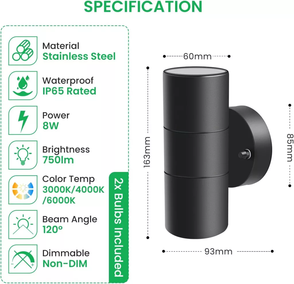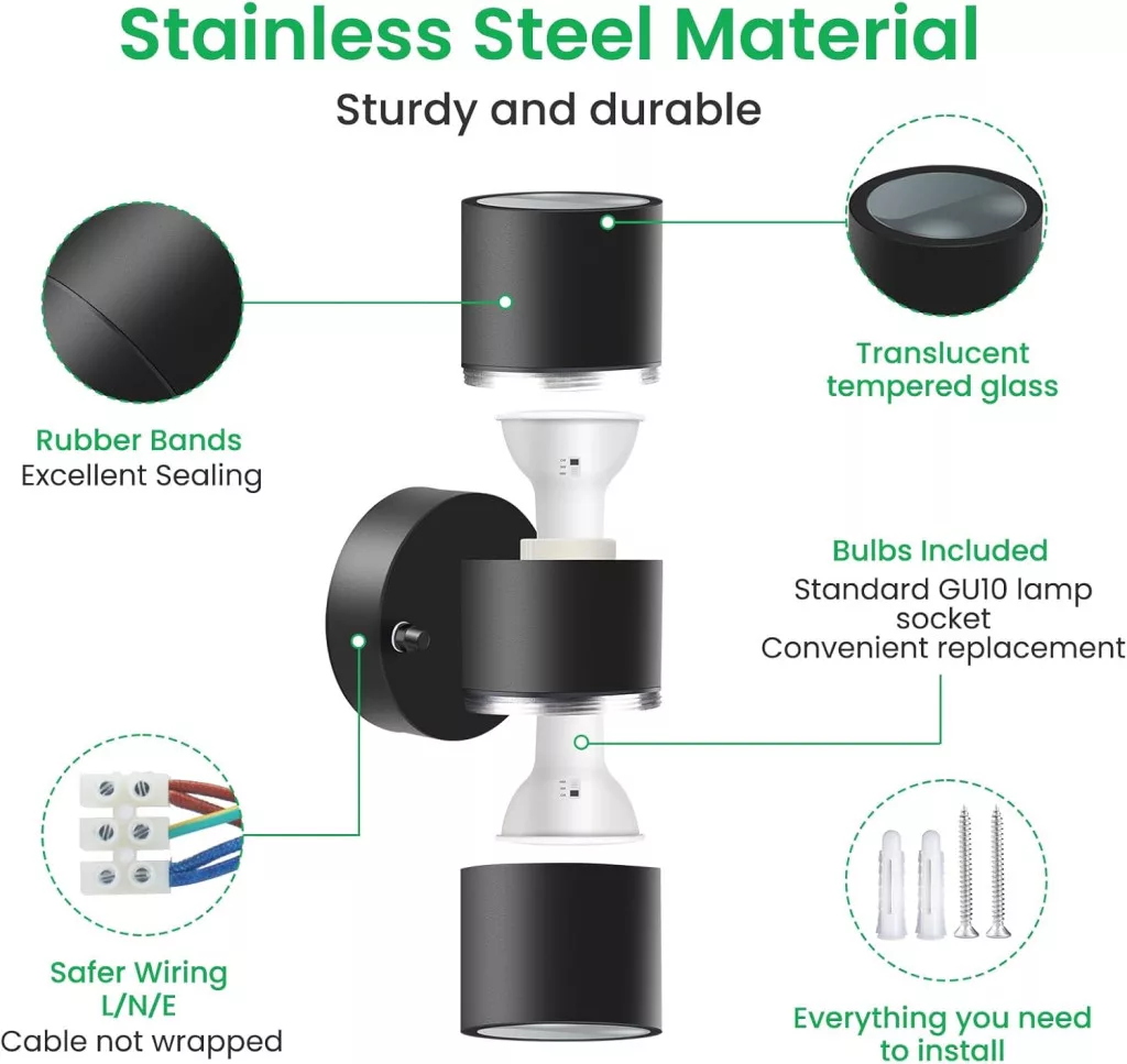 Lampa LED de perete pentru exterior ALUSSO LIGHTING este combinația perfectă între designul modern și funcționalitatea practică. Această lampă din oțel inoxidabil, rezistentă la apă IP65, vine cu 2 becuri GU10 de 8W, care asigură o emisie luminoasă de 750 lumeni. Lampa are trei temperaturi de culoare diferite (alb cald 3000K, alb neutru 4000K, alb rece 6000K), care pot fi comutate cu ușurință folosind butonul de pe bec. Este alegerea perfectă pentru grădini, terase, intrări și orice aplicație de exterior sau interior.