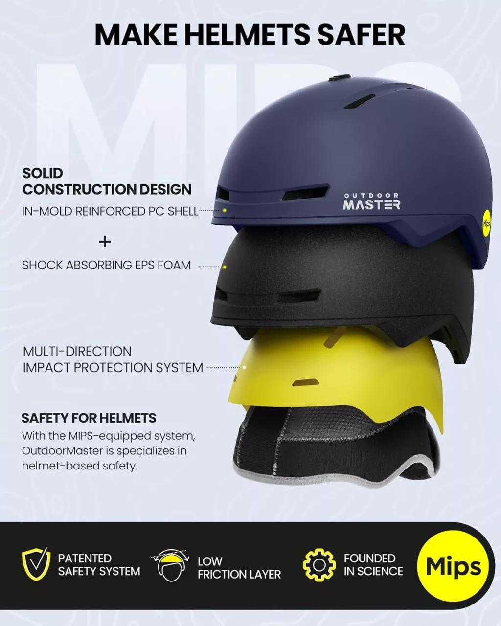 Caracteristicile de siguranță ale căștii de schi OutdoorMaster MIPS se numără printre cele mai înalte din industrie. Sistemul MIPS Evolve este un strat intern special care poate aluneca în interiorul căștii, reducând astfel forțele de rotație asupra creierului. Această tehnologie este deosebit de importantă, deoarece leziunile rotaționale cauzate creierului sunt adesea mai grave decât leziunile cauzate de impacturi directe.