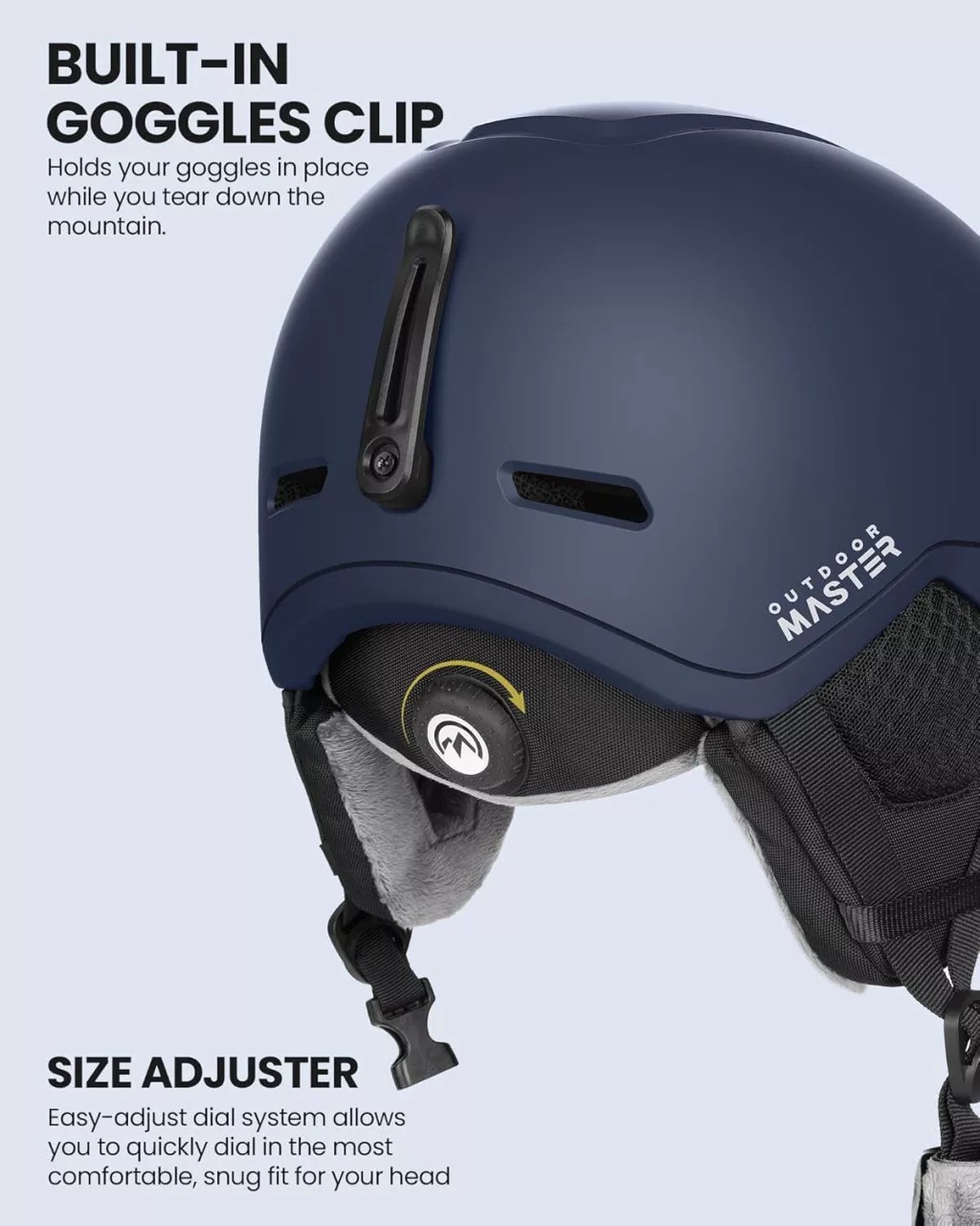 Confortul căștii de schi OutdoorMaster MIPS constă în detalii. Protecția pentru urechi și căptușeala interioară detașabile și lavabile sunt realizate cu căptușeală lungă și pufoasă, care este moale și caldă. Căptușeala nu este doar confortabilă, ci ajută și la stabilizarea căștii.