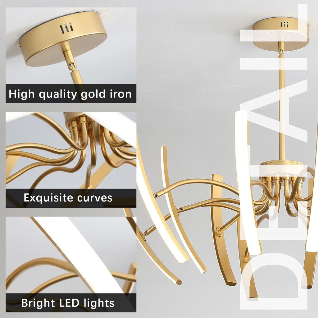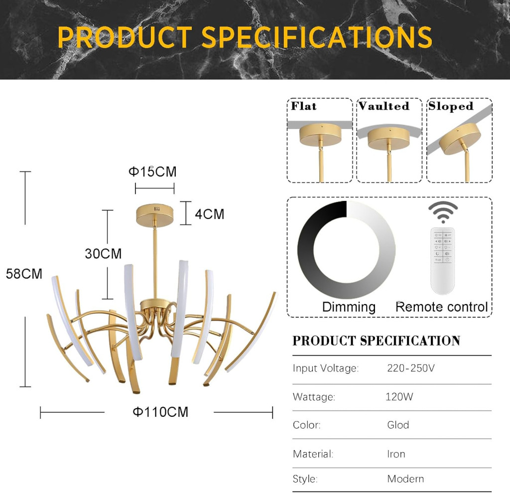 Descoperiți lampa de plafon reglabilă minifair de 120W, care creează un echilibru perfect între designul modern și iluminatul funcțional. Acest candelabru auriu, cu formă geometrică, nu este doar un corp de iluminat, ci și o operă de artă, care devine imediat elementul central al camerei. Lampa, cu un diametru de 110 cm și o înălțime de 58 cm, are 12 surse de lumină LED separate, fiecare dintre ele fiind rotativă individual, astfel încât să puteți personaliza complet direcția luminii și aspectul candelabrului.
