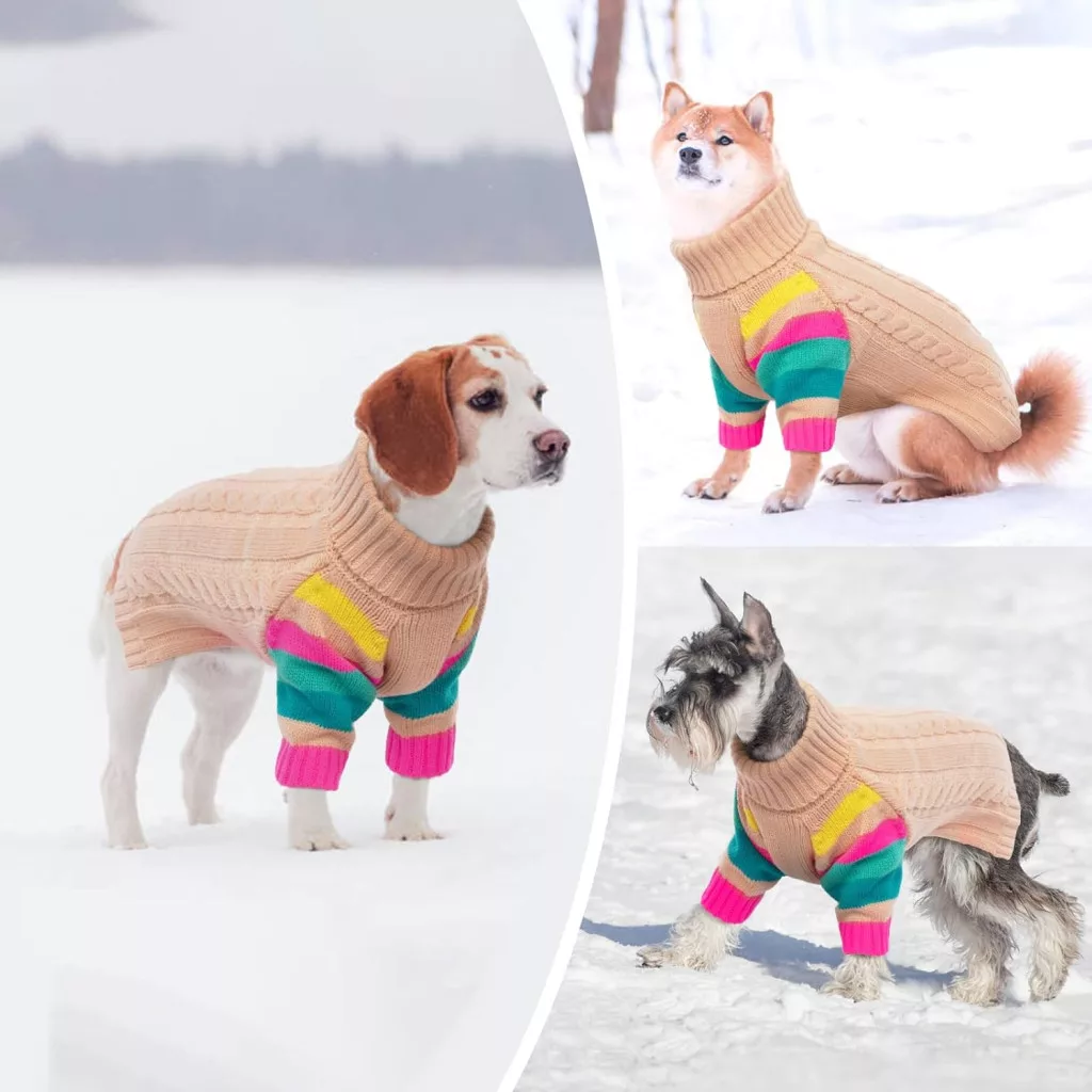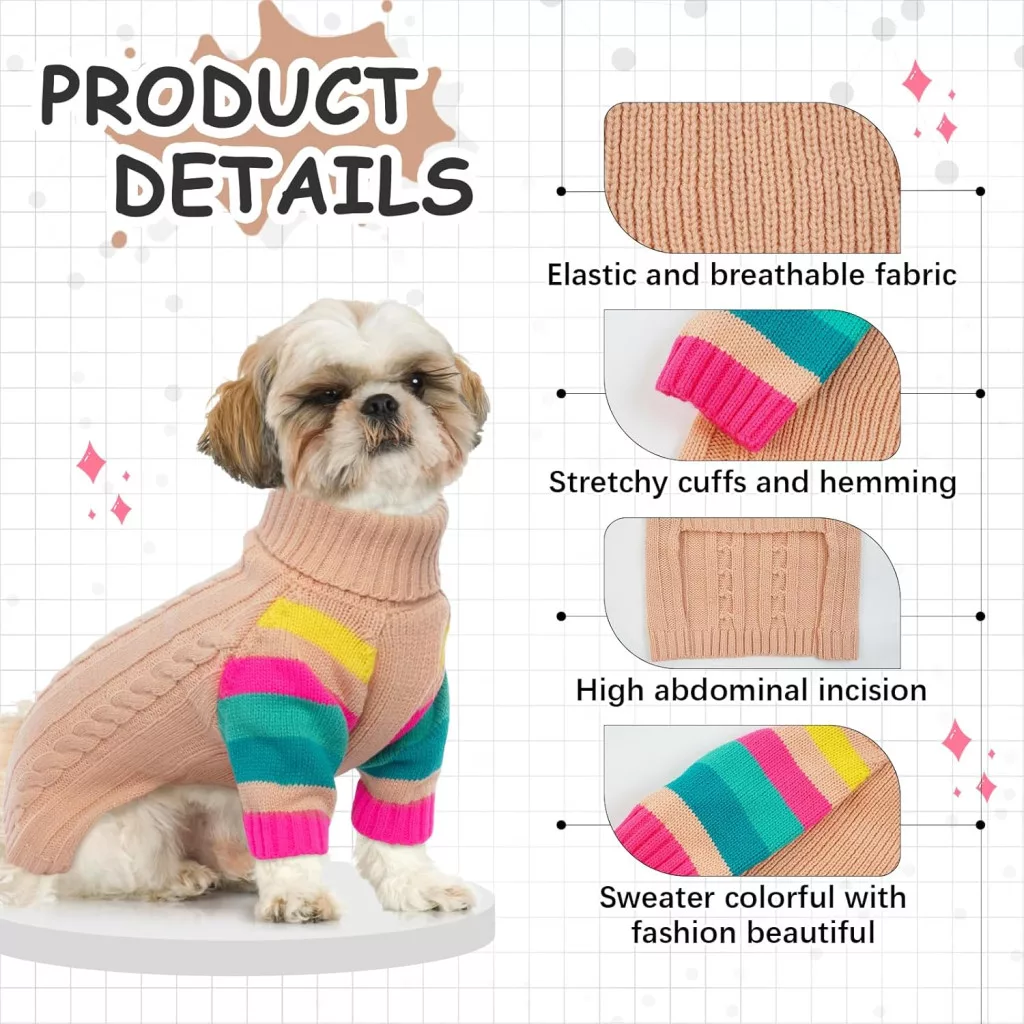 În zilele reci de iarnă, prietenul nostru patruped merită și el confort și căldură. Puloverul pentru câini OUOBOB este special conceput pentru câinii de talie mică, pentru a-i menține eleganți și călduroși pe vreme rece. Acest pulover atrăgător, cu guler înalt, este alegerea perfectă pentru chihuahua, teckel și alte rase de câini de talie mică, care au nevoie de protecție suplimentară împotriva frigului. Partea elastică a gulerului și manșetele asigură îmbrăcarea și dezbrăcarea ușoară, în timp ce marginile la modă, în culorile curcubeului, oferă animalului tău de companie un aspect unic.