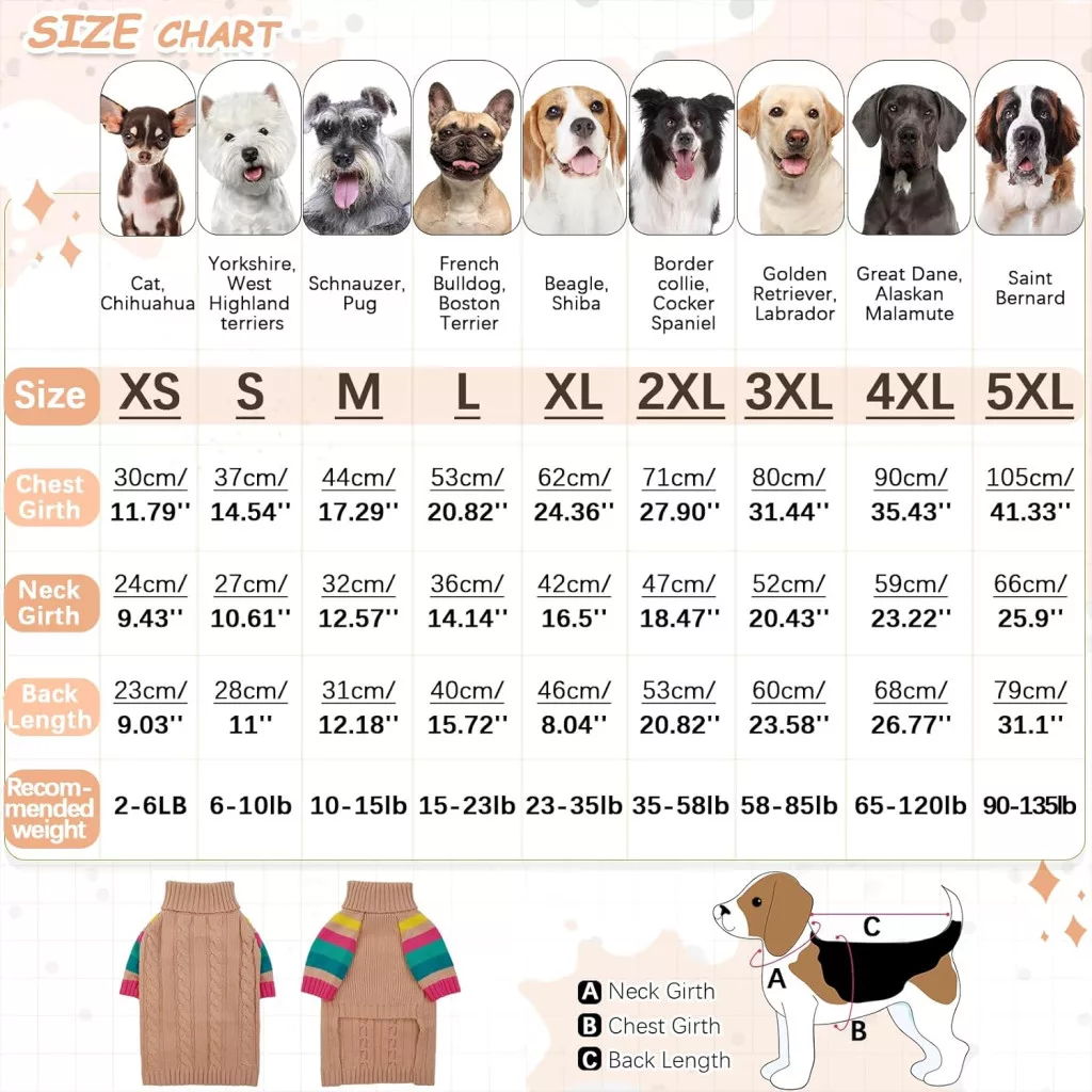 Puloverul pentru câini OUOBOB este disponibil în 9 mărimi diferite, de la XS până la 5XL, astfel încât poate fi găsită mărimea potrivită pentru aproape orice rasă de câini. Mărimea S este alegerea ideală pentru următoarele rase: