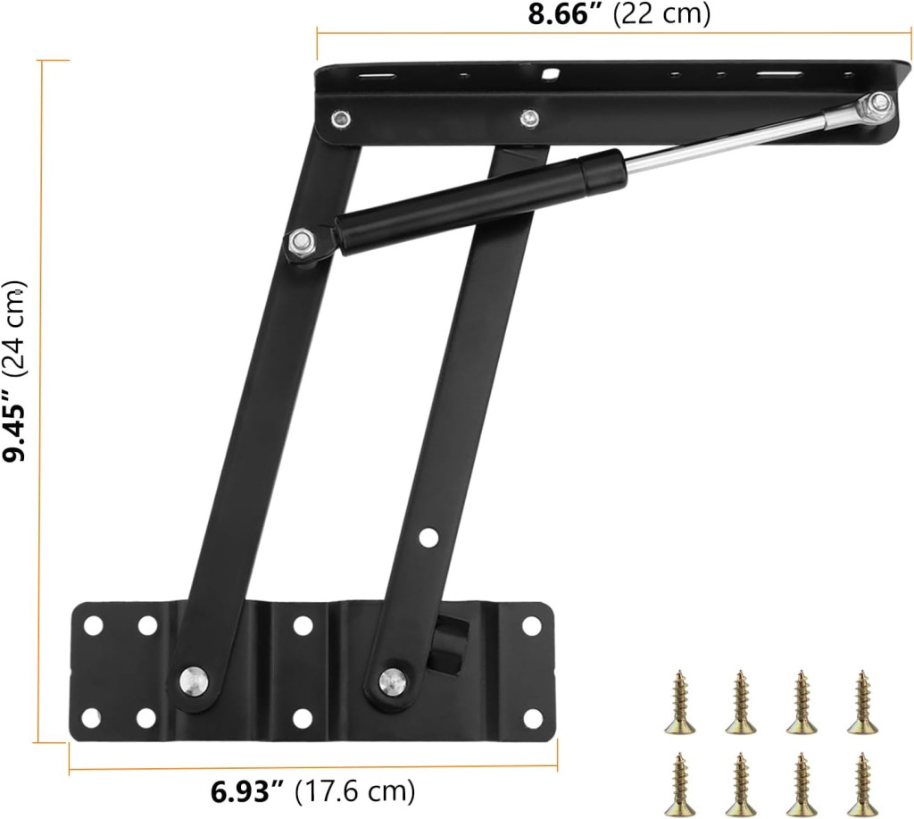 Dimensiunile mecanismului de ridicare: lungime superioară 22 cm, înălțime 24 cm, lungime inferioară 17,6 cm. Aceste dimensiuni permit utilizarea pe scară largă pentru diverse piese de mobilier. Culoarea neagră este elegantă și discretă, potrivindu-se bine cu orice stil de mobilier.