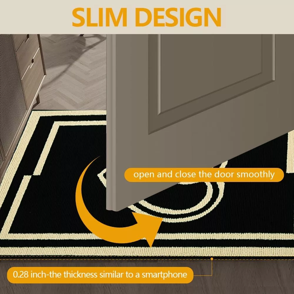 Partea inferioară antiderapantă a covorașului asigură fixarea sigură pe poziție, rămânând stabil chiar și în condiții de umezeală. Datorită profilului său jos, ușa nu se va bloca în acesta, garantând o utilizare confortabilă.