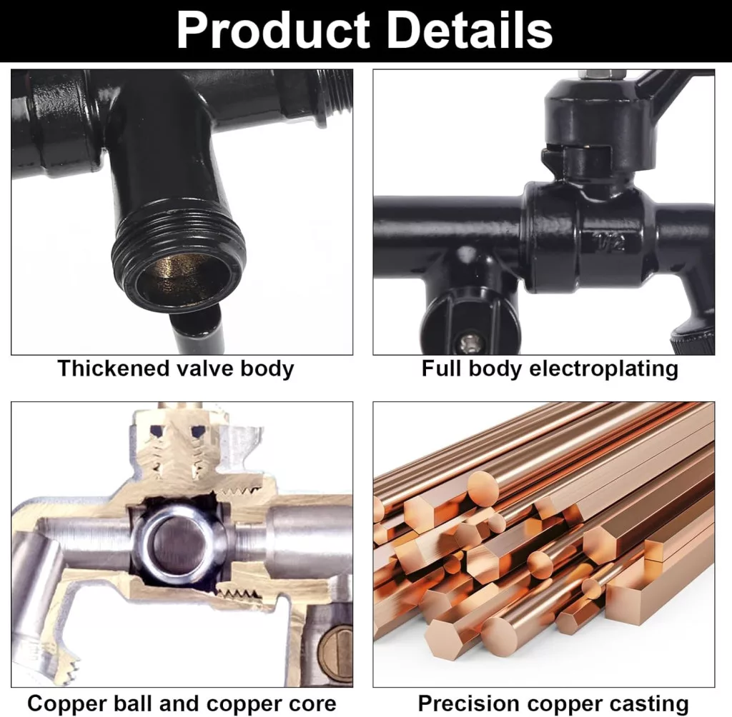 Robinetul de grădină dublu anti-îngheț FASBET este o soluție versatilă și durabilă pentru toate nevoile de alimentare cu apă în exterior. Acest robinet de înaltă calitate, de 3/4 inch, este fabricat 100% din alamă de înaltă duritate, ceea ce asigură o durată lungă de viață și o performanță fiabilă chiar și în cele mai dure condiții meteorologice. Stratul negru electroplacat nu numai că oferă un aspect elegant, dar oferă și o protecție suplimentară împotriva înghețului și a radiațiilor solare, astfel încât poate fi utilizat pe tot parcursul anului.