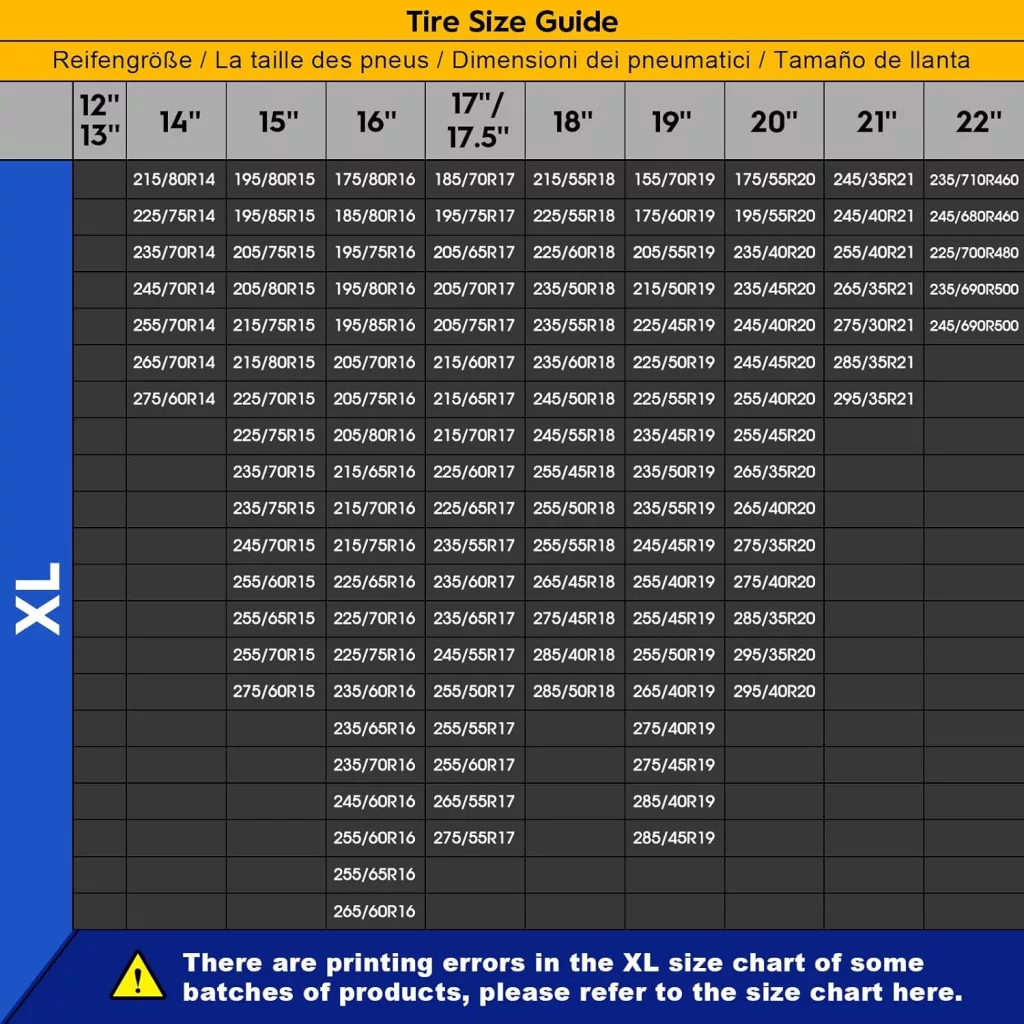 Datorită designului universal al produsului, acesta poate fi utilizat pentru majoritatea vehiculelor, dar verificați întotdeauna dimensiunea anvelopei înainte de cumpărare pentru a selecta dimensiunea corectă. Dimensiunea XL este special concepută pentru anvelopele mai mari, asigurând astfel potrivirea și funcționarea perfectă.