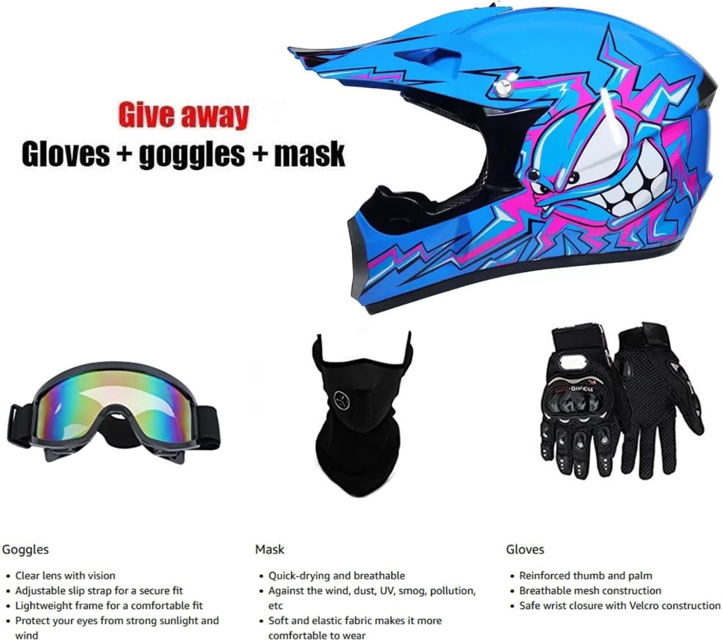 Această cască motocross profesională pune accent pe siguranța și confortul copiilor. Designul aerodinamic și carcasa exterioară din ABS garantează protecție maximă pe orice teren. Orificiile de ventilație din față și din spate asigură un flux optim de aer, făcând-o o alegere ideală și pentru călătorii lungi. Casca vine ca un echipament complet: cască, ochelari, mănuși și mască, fiind un cadou perfect pentru copii și adolescenți.