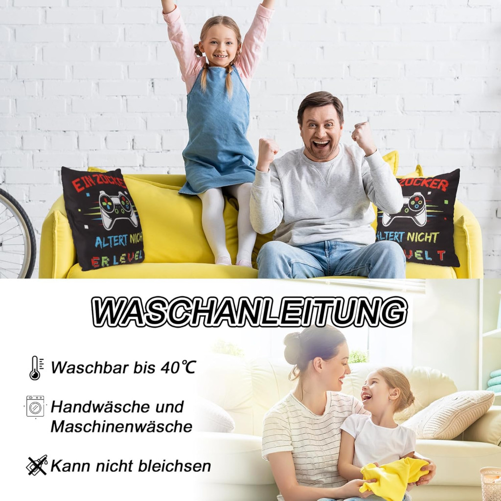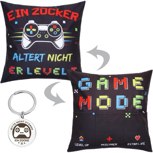 Această față de pernă decorativă originală de 45 x 45 cm este alegerea perfectă pentru orice gamer și fan al jocurilor video. Cu un model pe două fețe și un text amuzant ("Ein Zocker altert nicht. He levels."), această pernă garantează un zâmbet pe față. Fabricată din material poliesteric de înaltă calitate, care este moale, durabil și ușor de curățat. Pachetul include și un breloc practic.