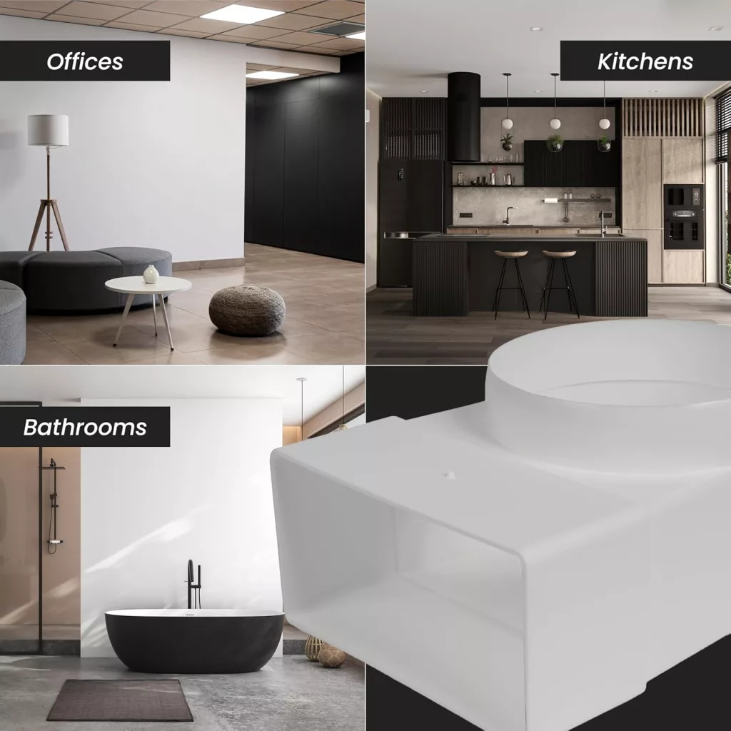 Funcționează deosebit de bine cu ventilatoarele de extracție populare pentru băi, extractoarele de mirosuri din bucătărie și sistemele generale de ventilație. Datorită dimensiunilor standard, poate fi integrat cu ușurință în sistemele existente, fără a fi necesare modificări semnificative.