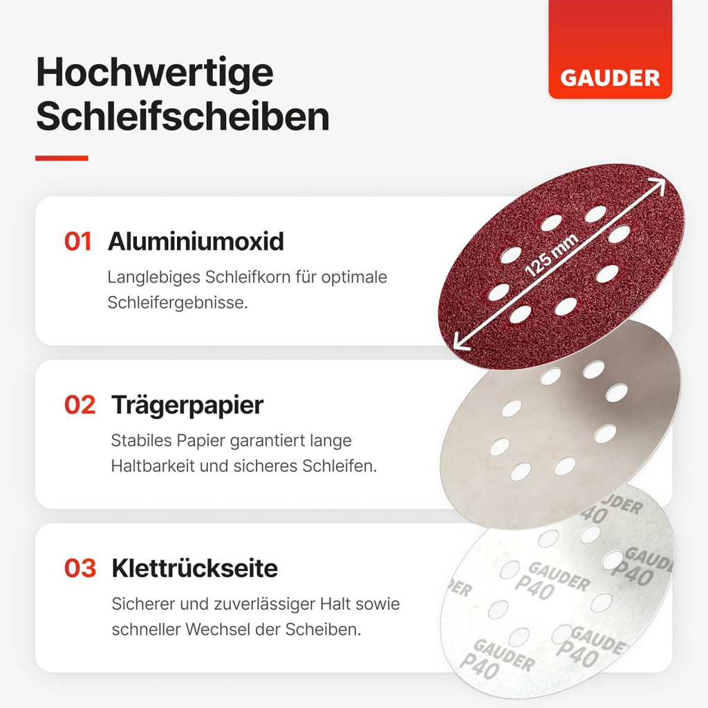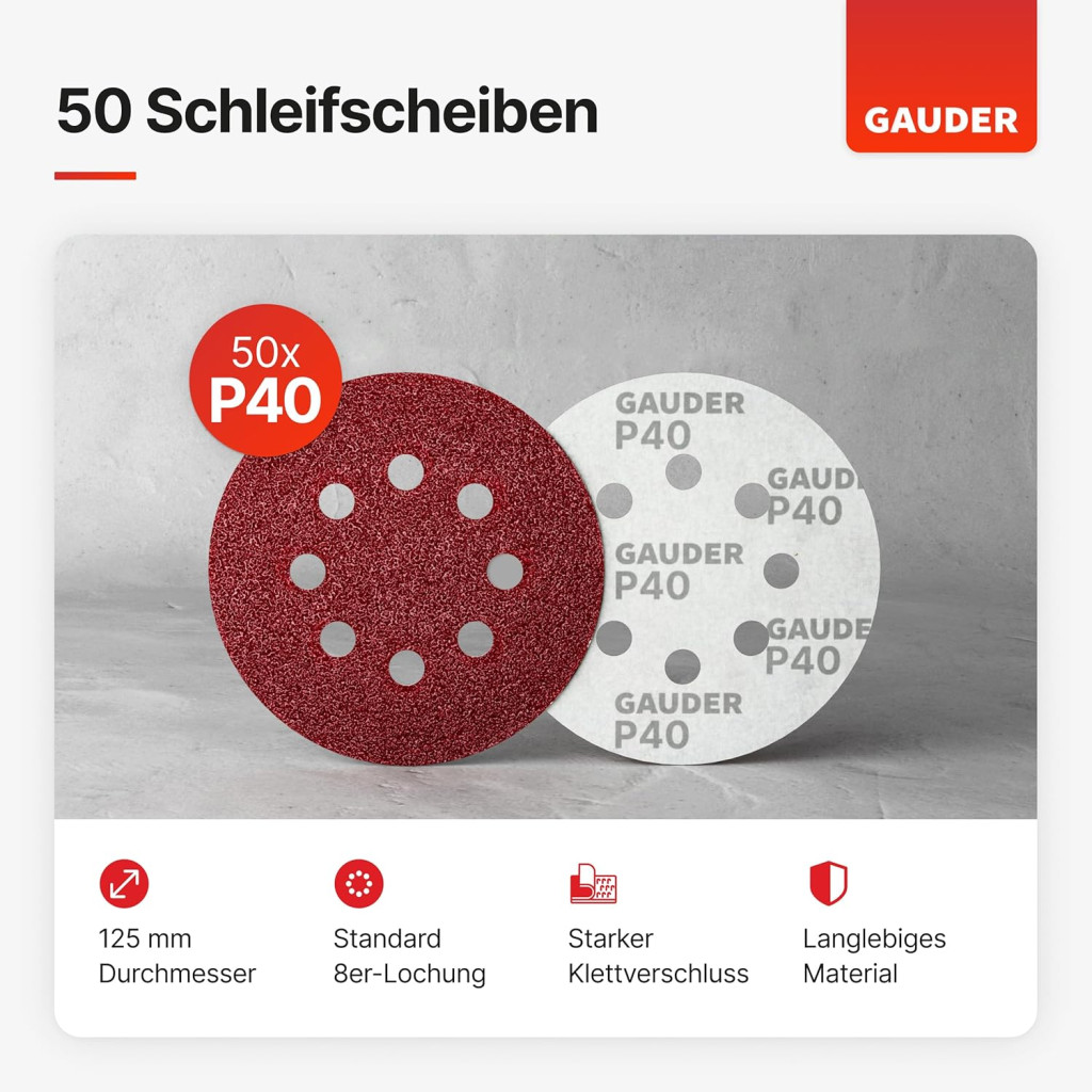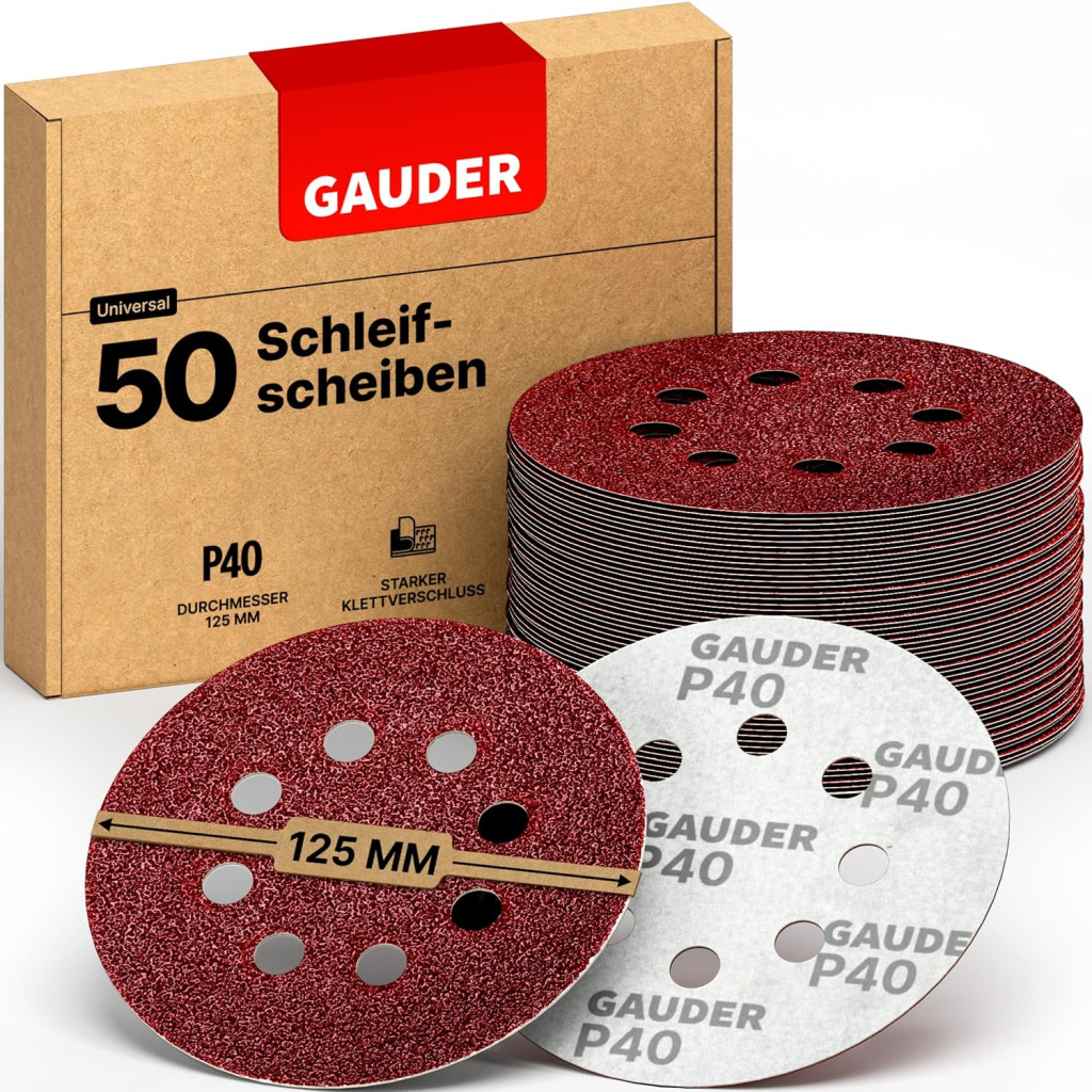 Discurile abrazive GAUDER de 125 mm cu granulație P40 reprezintă o alegere excelentă pentru toți cei care caută hârtie abrazivă de calitate profesională la un preț rezonabil. Pachetul de 50 de bucăți vă asigură că nu va trebui să cumpărați din nou prea curând, iar sistemul Velcro garantează schimbări rapide și ușoare. Fie că este vorba despre șlefuirea lemnului, metalului sau a altor materiale, aceste discuri oferă performanțe fiabile.