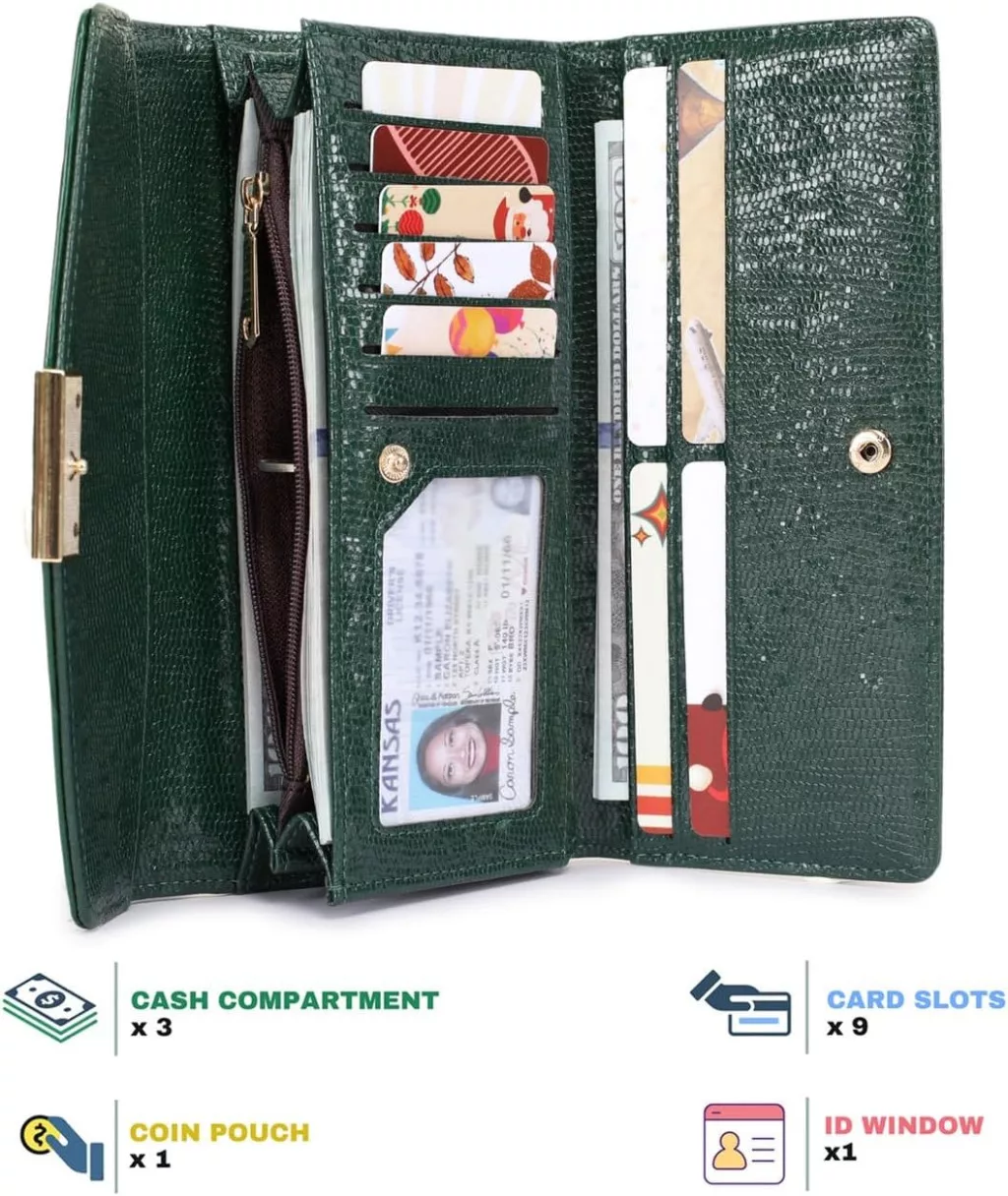 Portofel de damă Sunkky cu model de piele de crocodil - Portofel mare cu fermoar și compartimente multiple, piele ecologică verde, portofel lung modern pentru femei