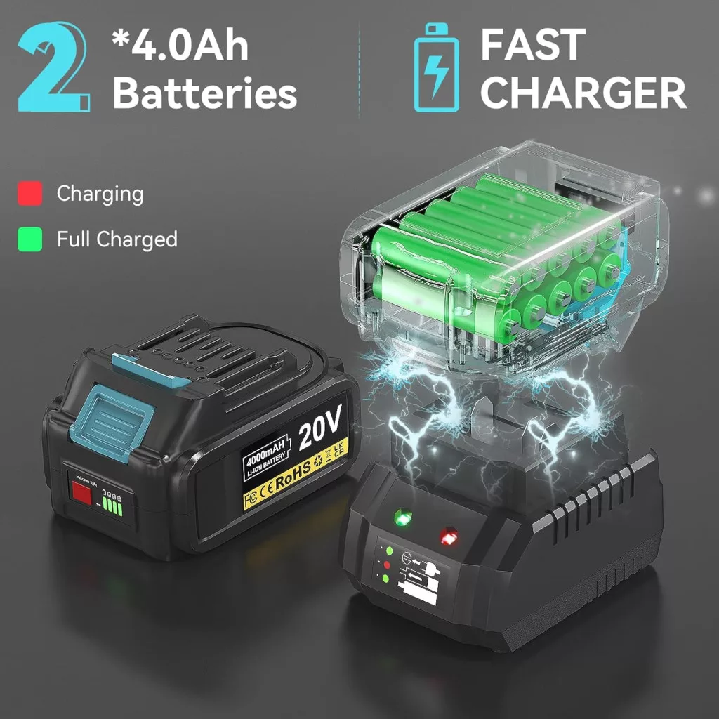 Setul include doi acumulatori litiu-ion de 4.0 Ah care funcționează la o tensiune de 20 V. Încărcătorul rapid încarcă complet bateriile în doar 3 ore, oferind până la 160 de minute de utilizare continuă cu o singură încărcare. Designul fără fir oferă libertate totală în timpul lucrului.
