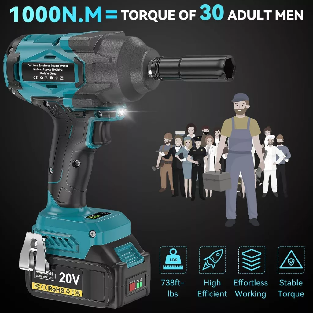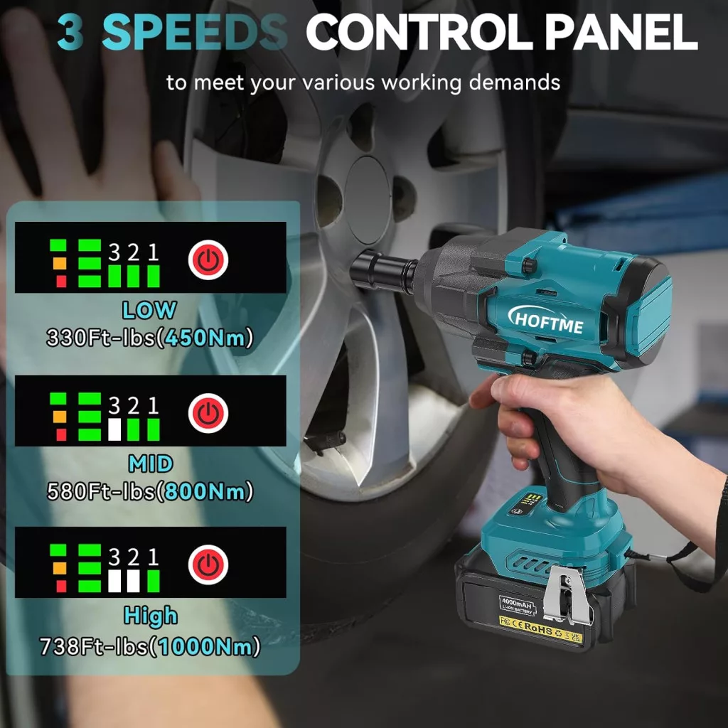 Cheia cu impact pe acumulator HOFTME este o sculă de calitate profesională, dotată cu un cuplu de 1000 N.m (738 Ft-Lbs). Această putere mare o face alegerea ideală pentru lucrări industriale grele, reparații auto, schimbarea anvelopelor mari și proiecte DIY. Dispozitivul funcționează la o viteză maximă de 3300 rotații pe minut, ceea ce garantează o muncă rapidă și eficientă.
