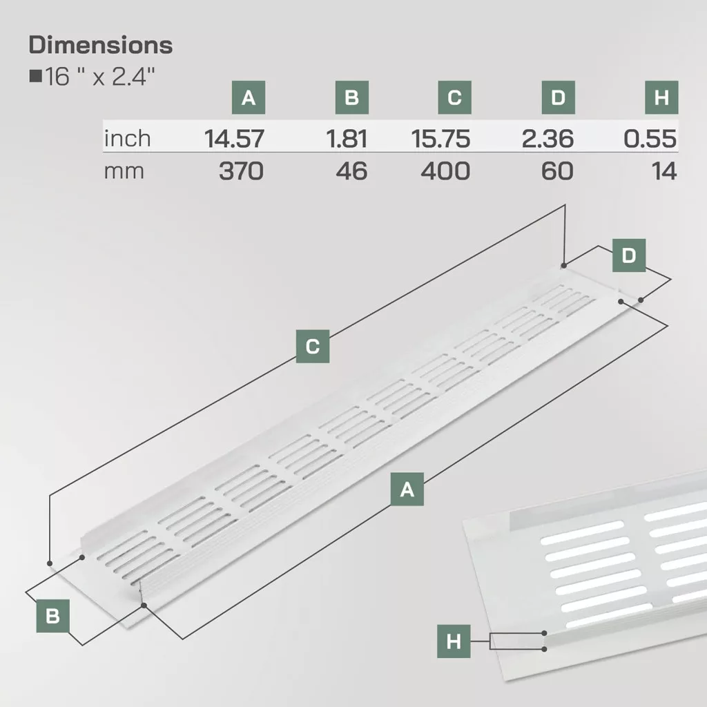 Grila de ventilație Vent Systems este o soluție universală, compatibilă cu majoritatea sistemelor de ventilație și încălzire. Dimensiunea de 400 x 60 mm este ideală pentru orificiile de ventilație și conductele standard. Materialul din aluminiu este ușor, făcând instalarea simplă și rapidă.