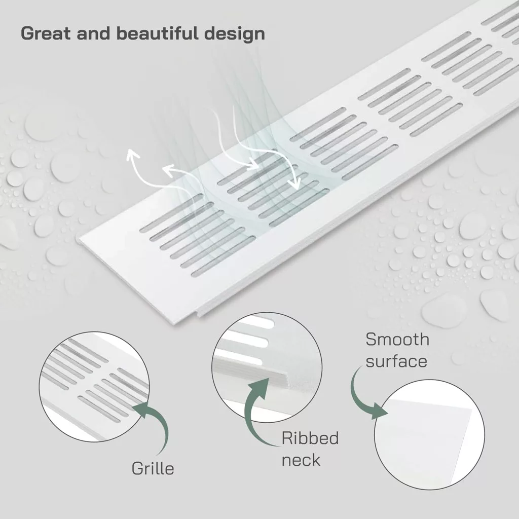 Grila de ventilație din aluminiu alb de 60 x 400 mm de la Vent Systems este simbolul calității profesionale și al fiabilității. Materialul din aluminiu anodizat garantează că produsul va rezista ani de zile, chiar și în cele mai solicitante condiții. Compatibilitatea cu temperaturi extreme (între -30 °C și +250 °C) asigură faptul că grila rămâne fiabilă în aplicații de încălzire, răcire și ventilație deopotrivă.