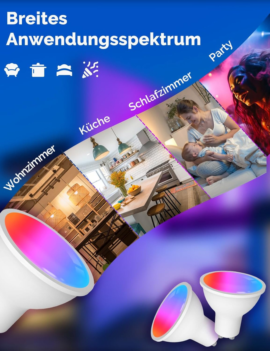 Bec LED Inteligent WiFi MOES GU10 - RGB cu Schimbare de Culoare, Dimmabil, 2700K-6500K, Compatibil Alexa, Google Home și Apple HomeKit, Muzică Sincronizată